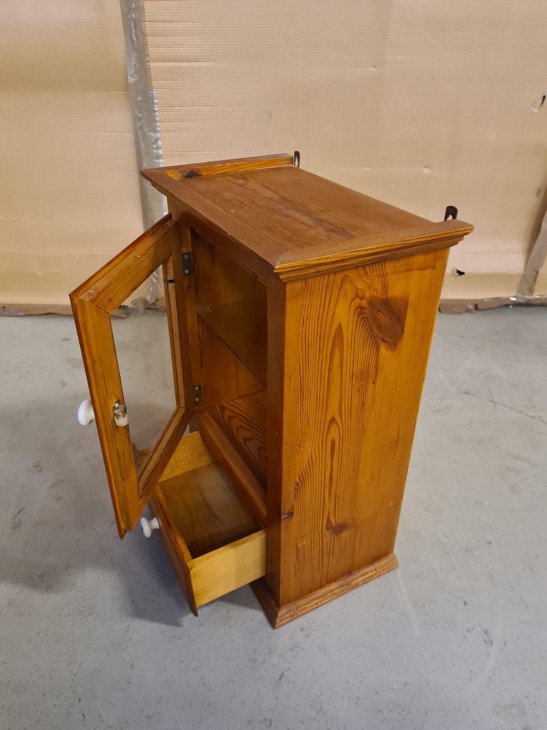 Vægskab i massivt fyrretræ med glashylde og skuffe, fra 1970erne.