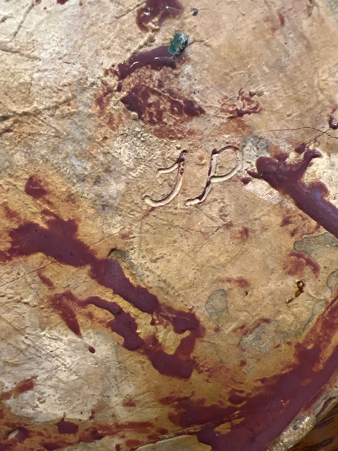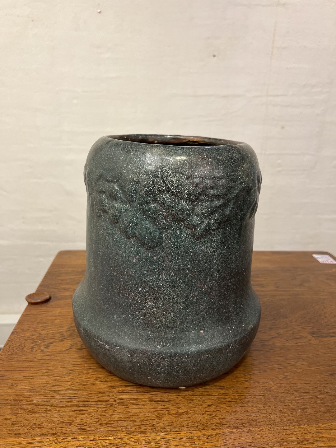 Text available in Danish: Jens Pedersen vase i glaseret lertøj med skønvirke dekoration. Udført hos Søren Kongstrand ca. 1910'erne. Vasen er fin, dog med små chips på skærven samt en hårrevne i bunden, se foto.