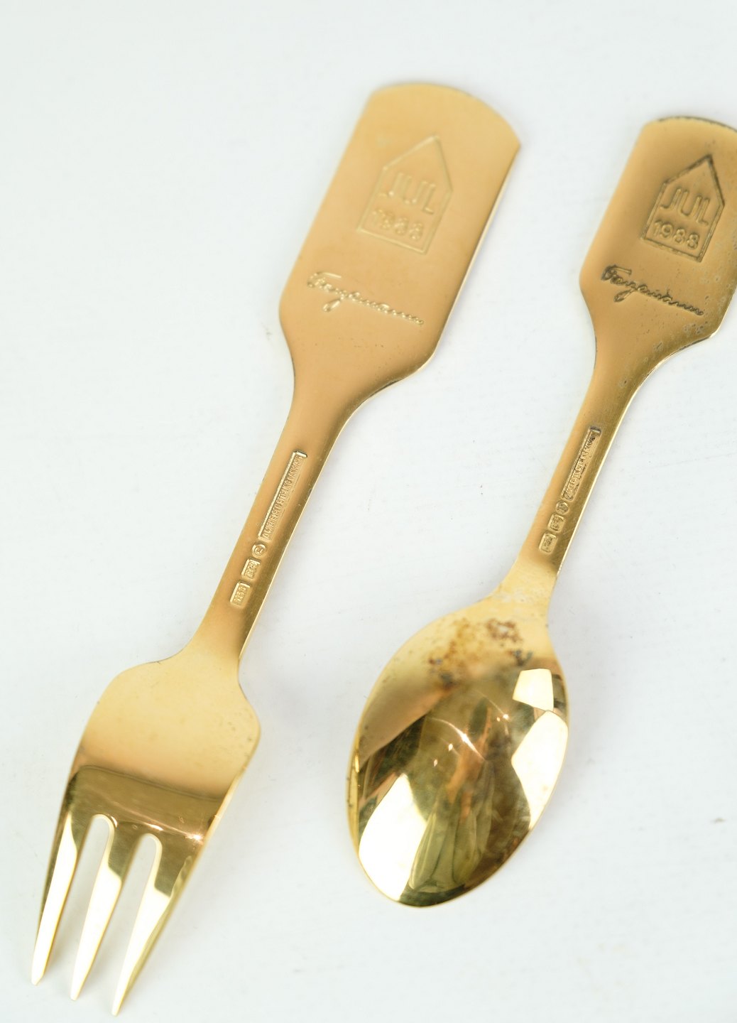 Anton Michelsen Julebestik er fremstillet af forgyldt sterlingsølv og har smukke emaljemotiver på begge sider. Dette sæt fra 1988 har en juleske og en julegaffel, der begge er tegnet af Knud Erik Færgemann for A. Michelsen. Motivet på bestikket er "Byen" og vil være en elegant og festlig tilføjelse til dit juledekoration. Det er en klassisk og tidløs julepynt, som vil se smuk ud på dit juledækket bord og vil være en værdifuld og holdbar gave at give videre til generationerne. Send os en email hvis du ønsker at købe en af delene separat.