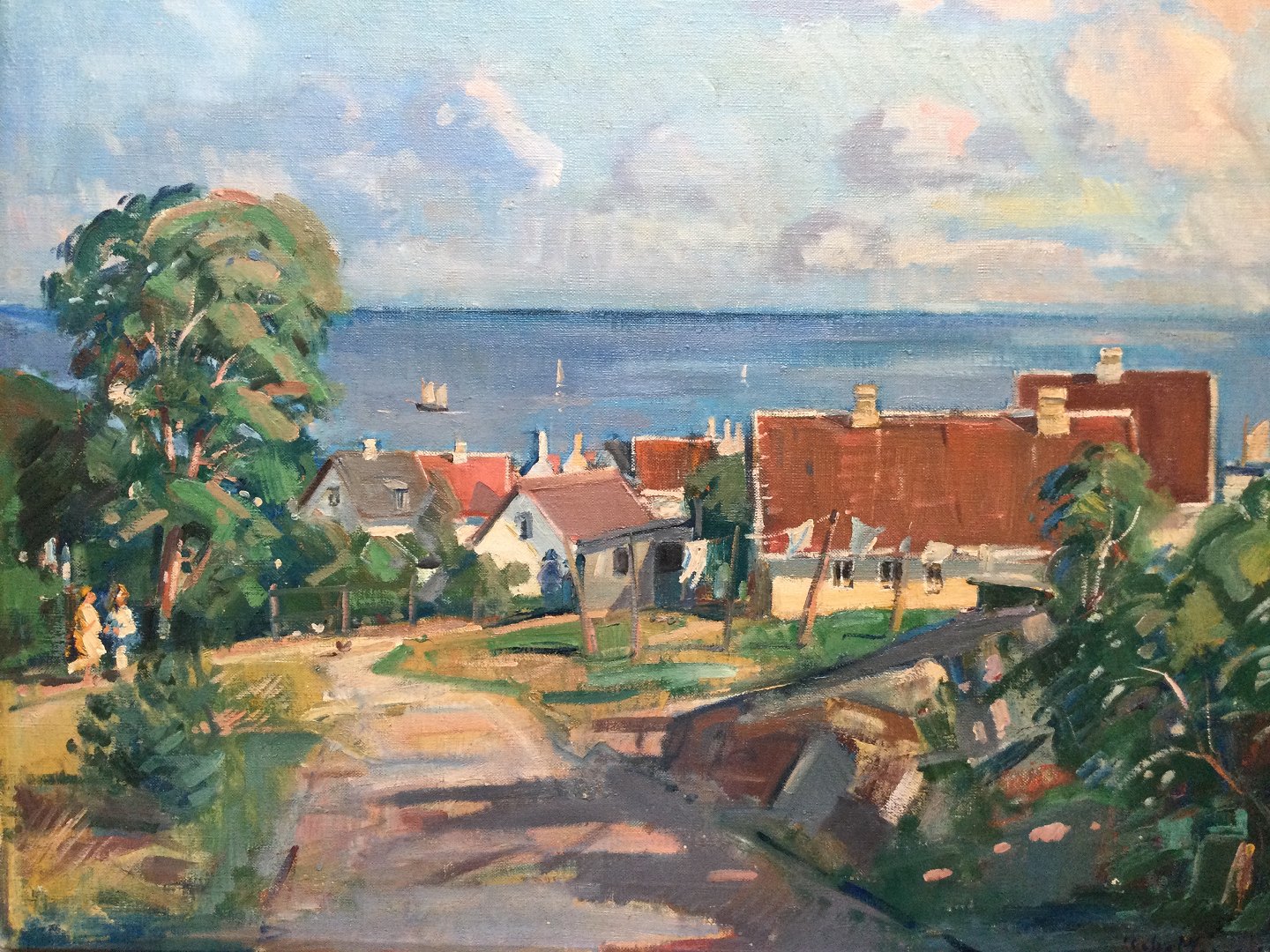 Maleri af Johannes Meyer Andersen - Vue ud over by på Bornholm.
