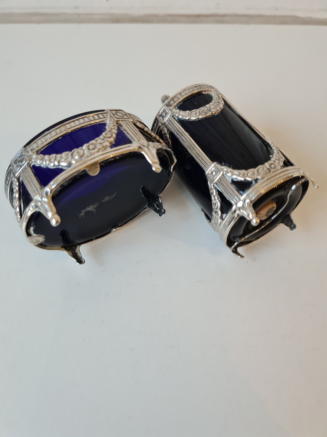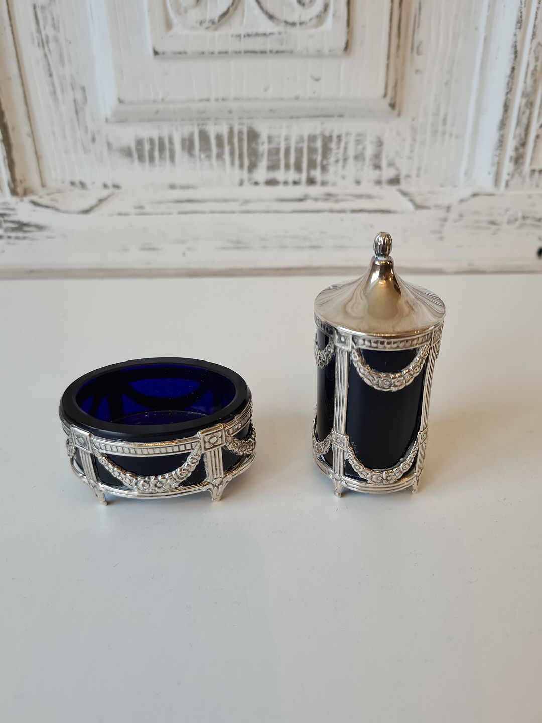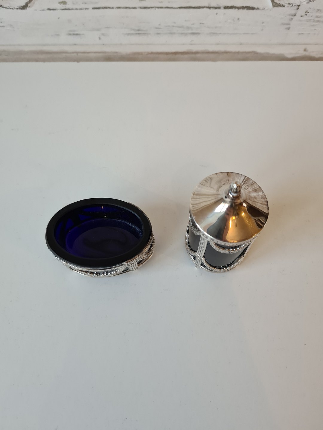 Saltkar & peberbøsse i sterlingsølv og blåt glas produceret i Sverige