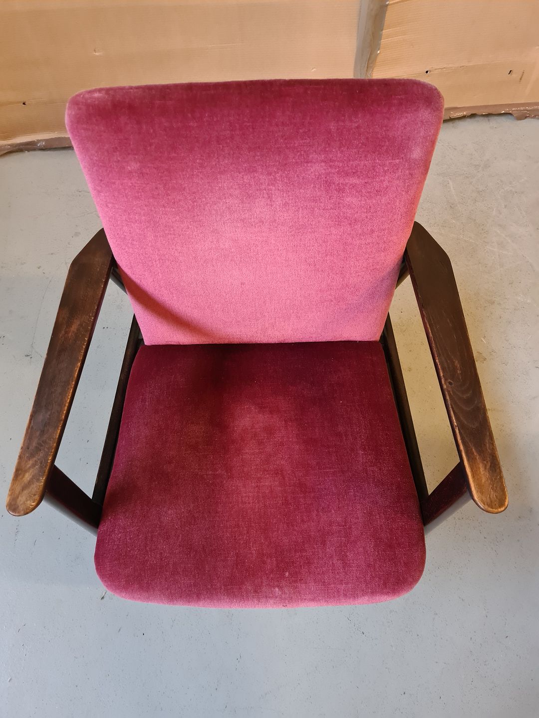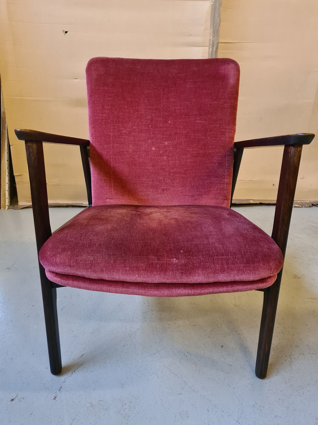 Lænestol i egetræ med velour betræk, fra 1960erne.