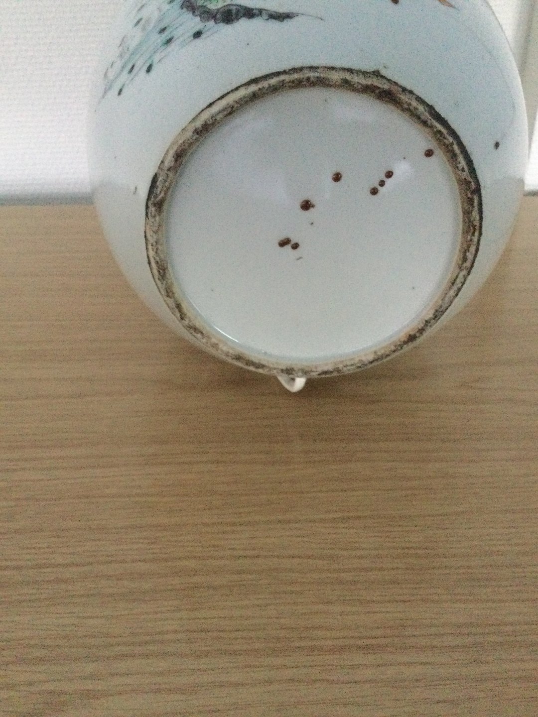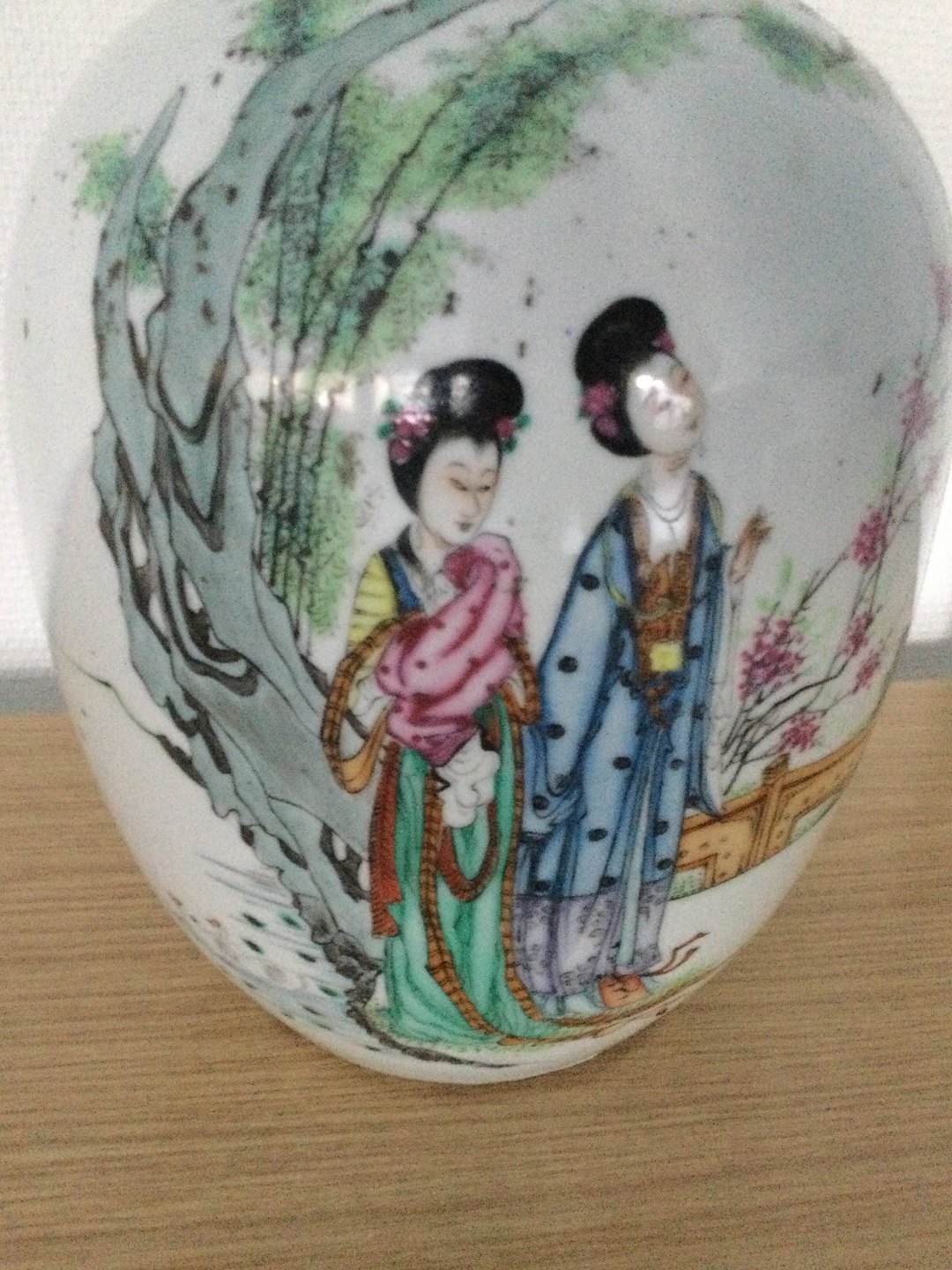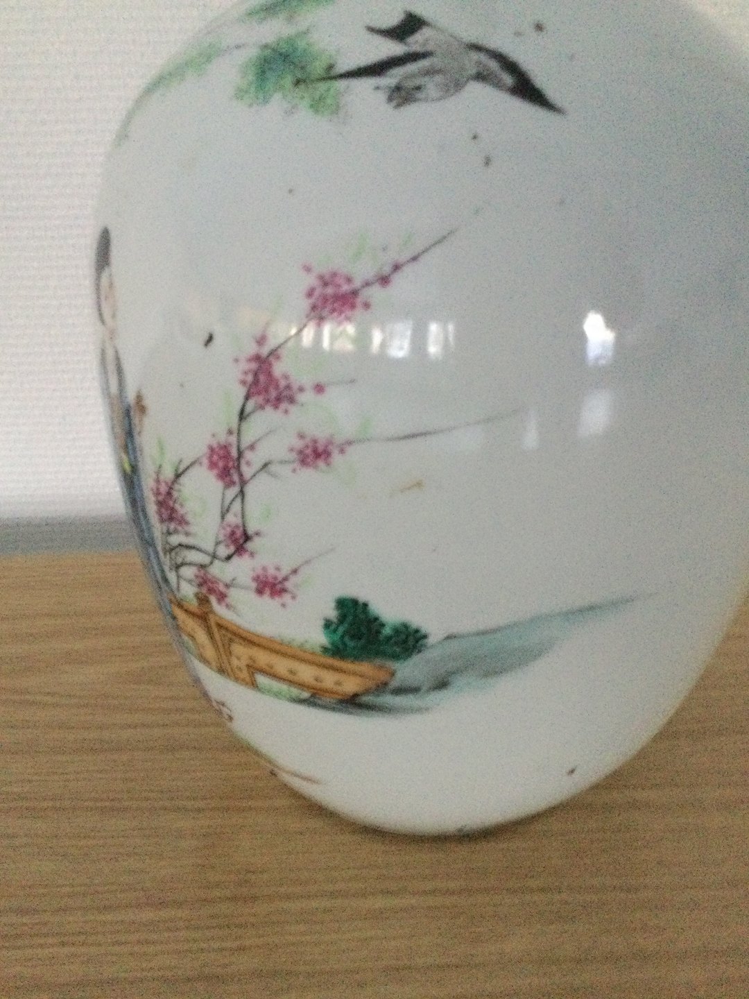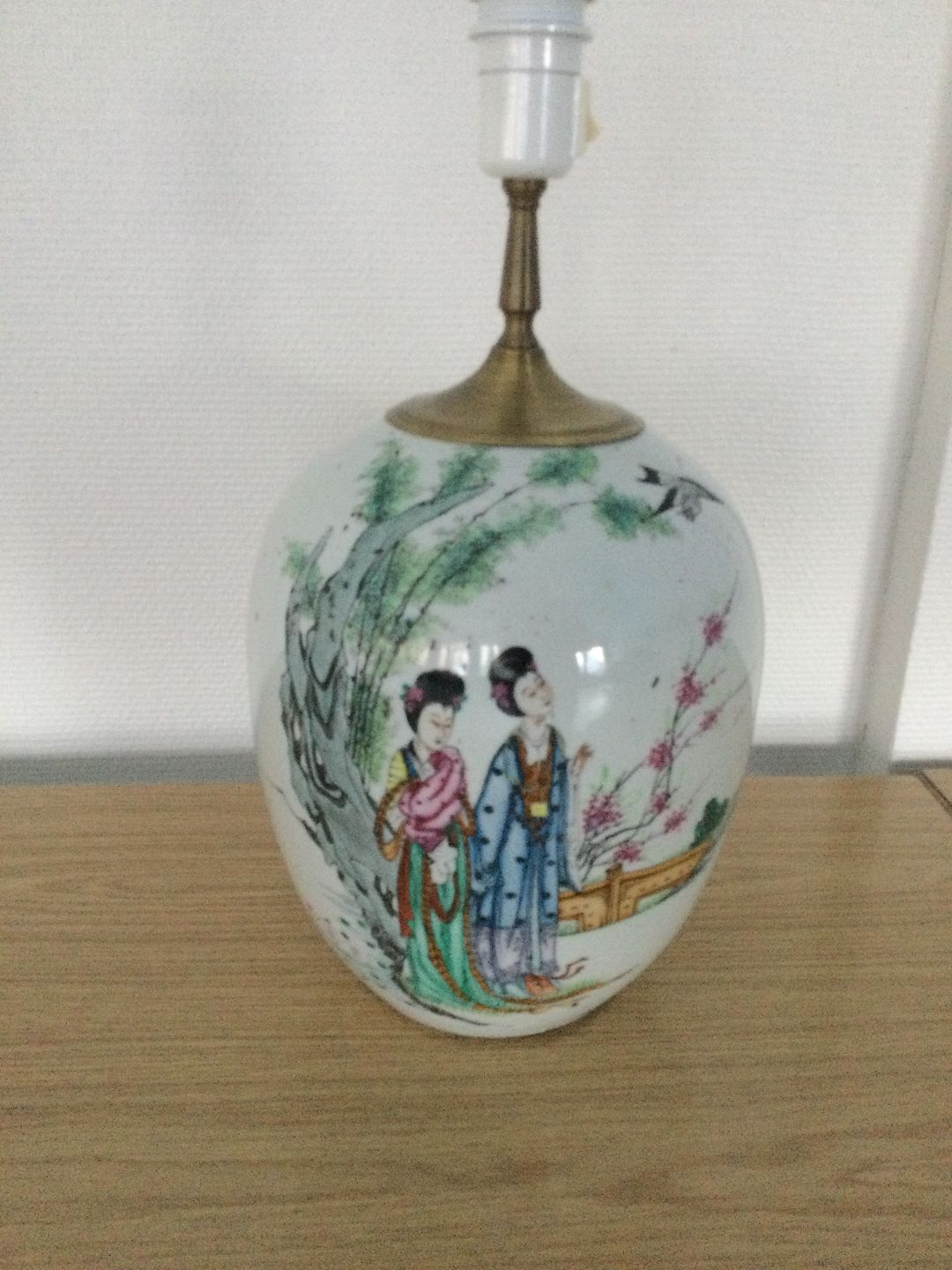 Stor kinesisk porcelæns lågkrukke omlavet til bordlampe.