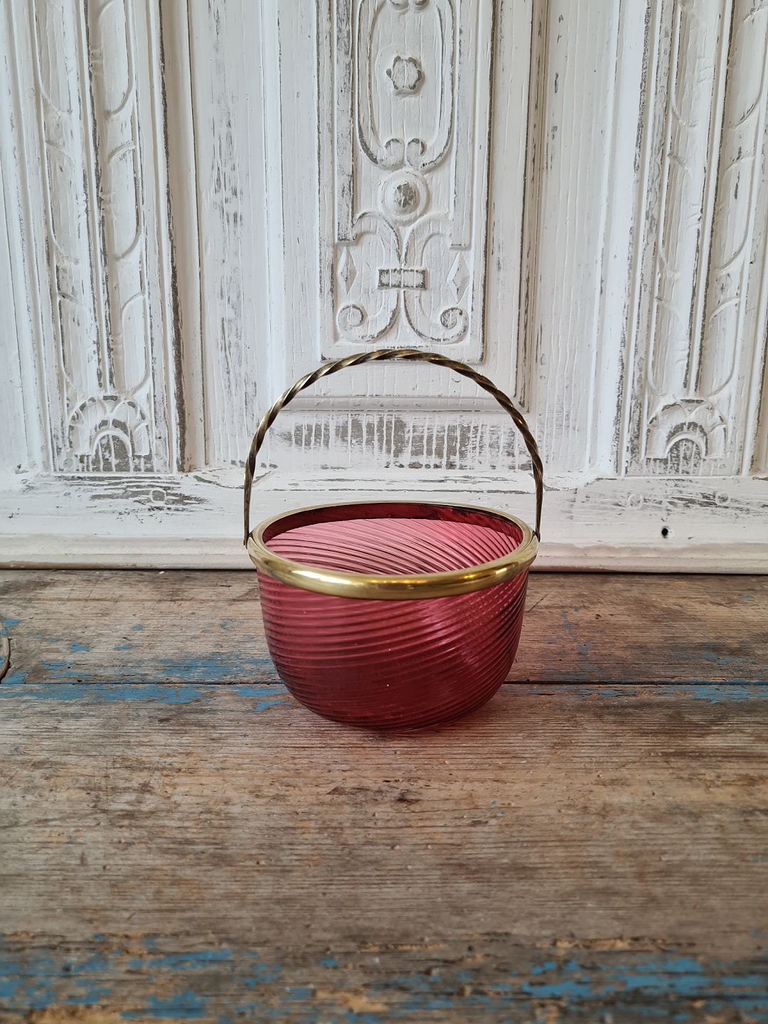 1800 tals sukkerskål i hindbærfarvet glas med messingmontering