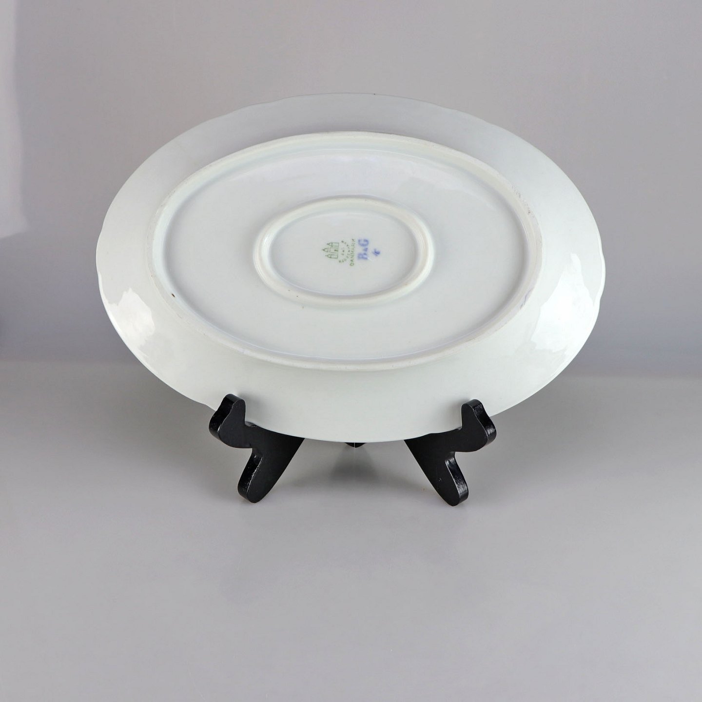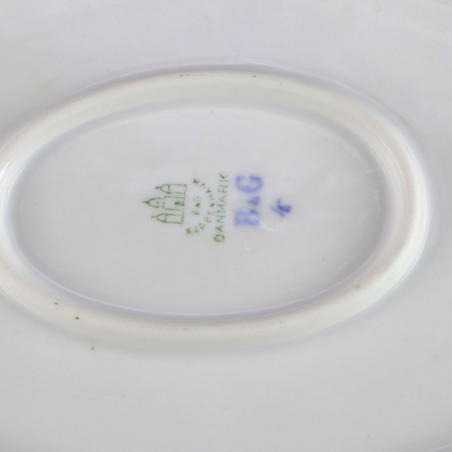 Fad i hvidt porcelæn med skelform og motiv af guirlander med blå blomster
