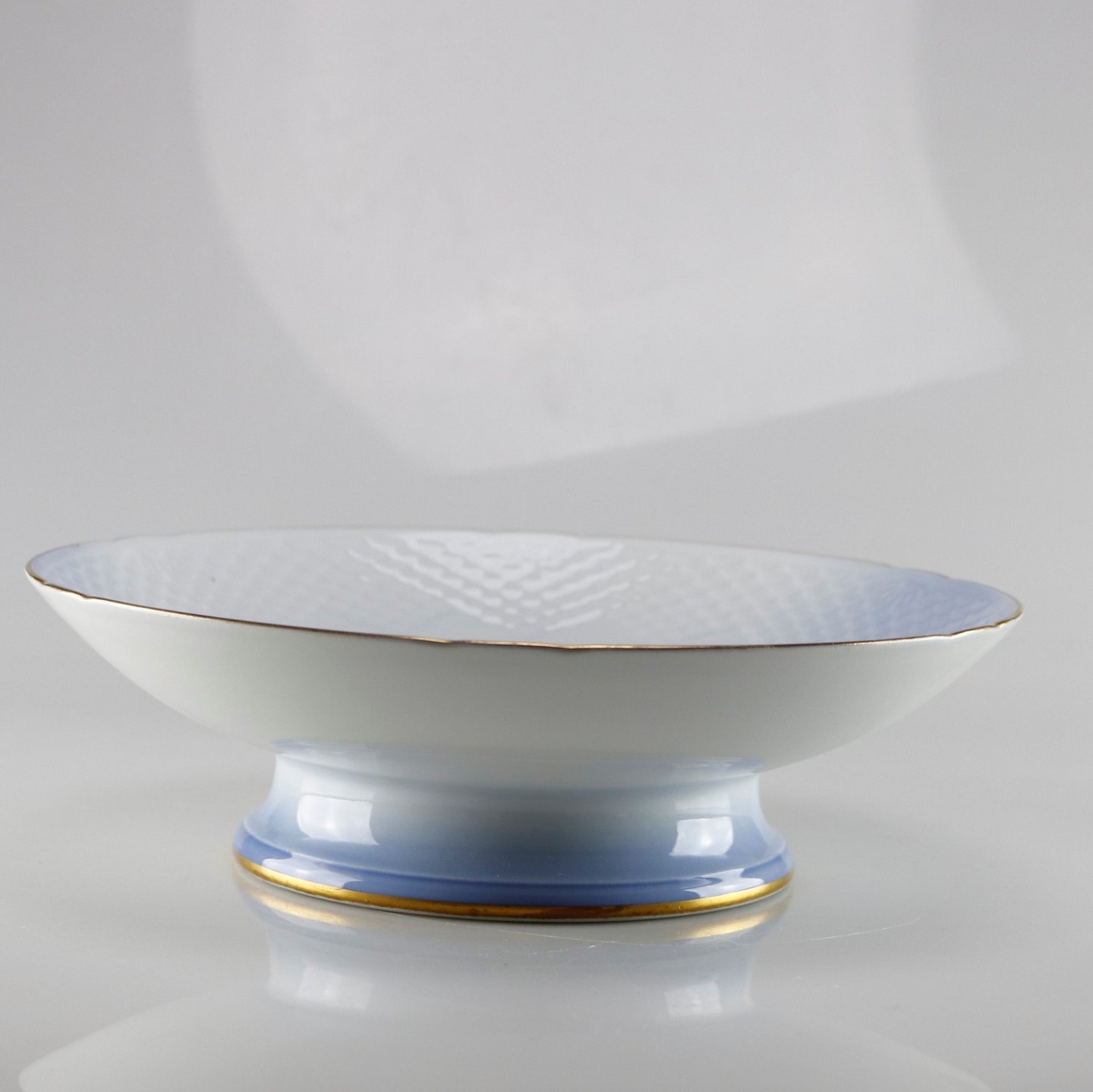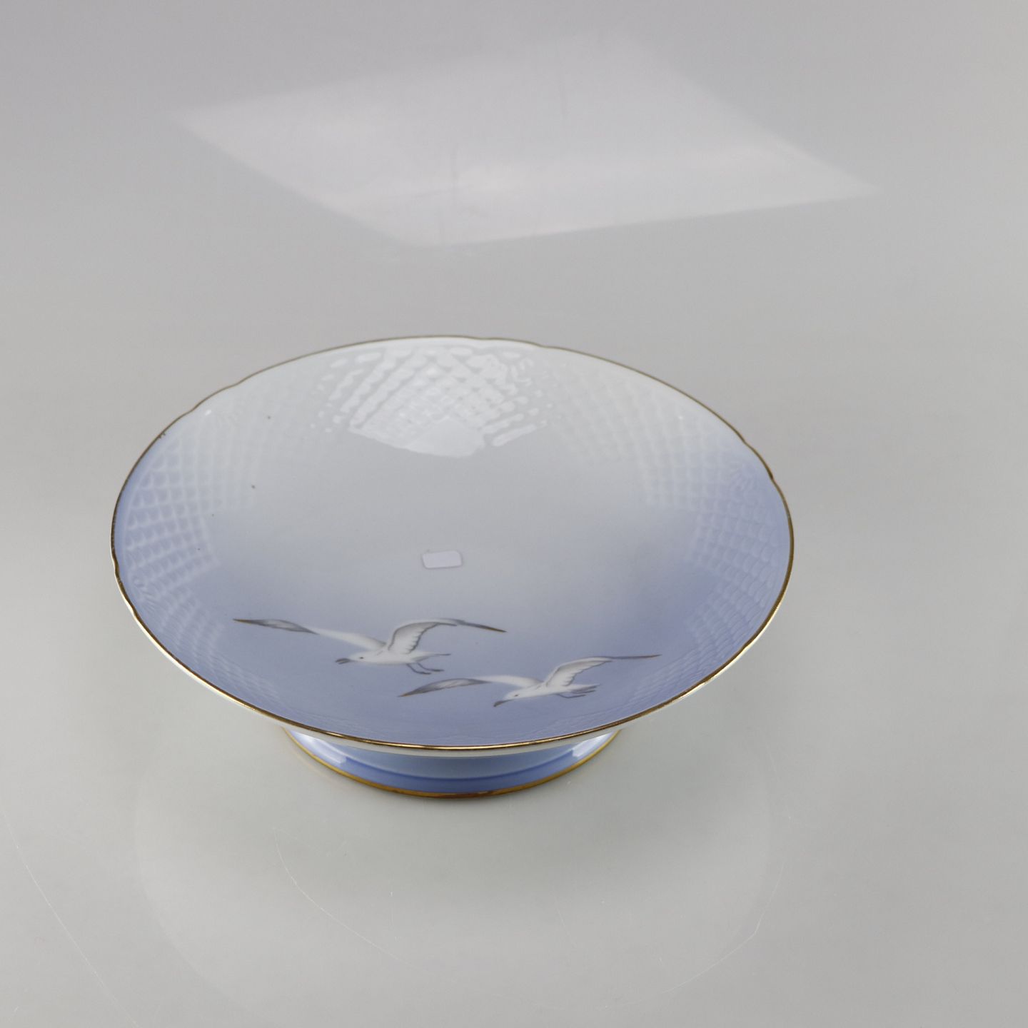 Porcelæns fad på fod med motiv af måger og guldkant.