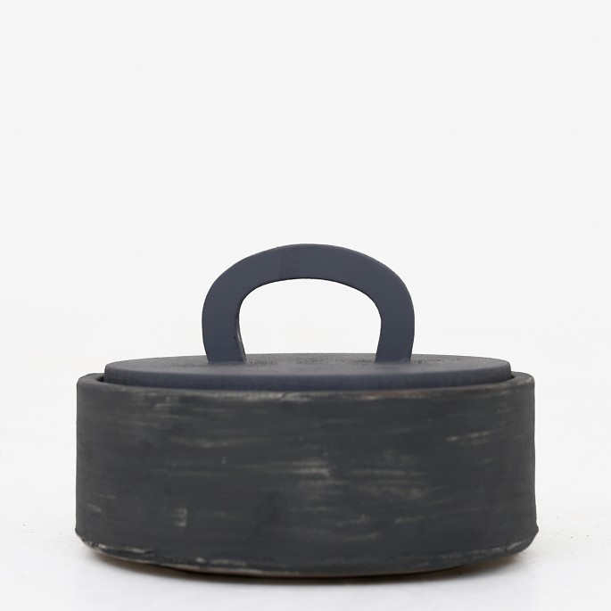 Rund, håndlavet lågkrukke i stentøj og låg af træ.