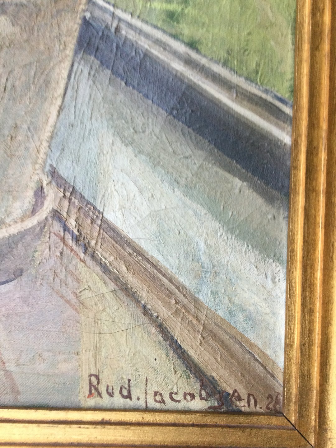Maleri af Rud. Jacobsen 1928 - Opstilling med kaktus i vindueskarm.