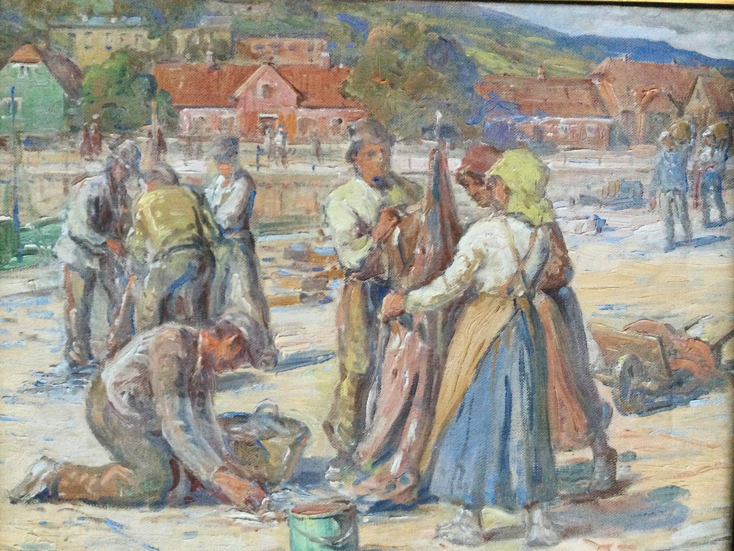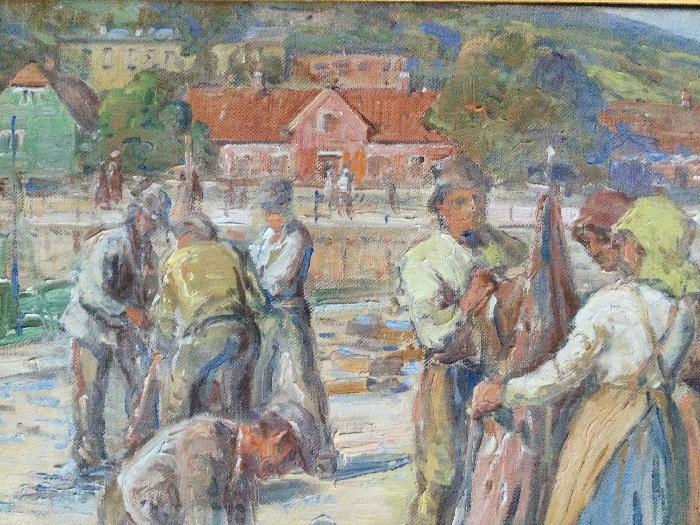 Maleri af Carl Budtz-Møller - Sydlandsk Havneparti med personer 1950.