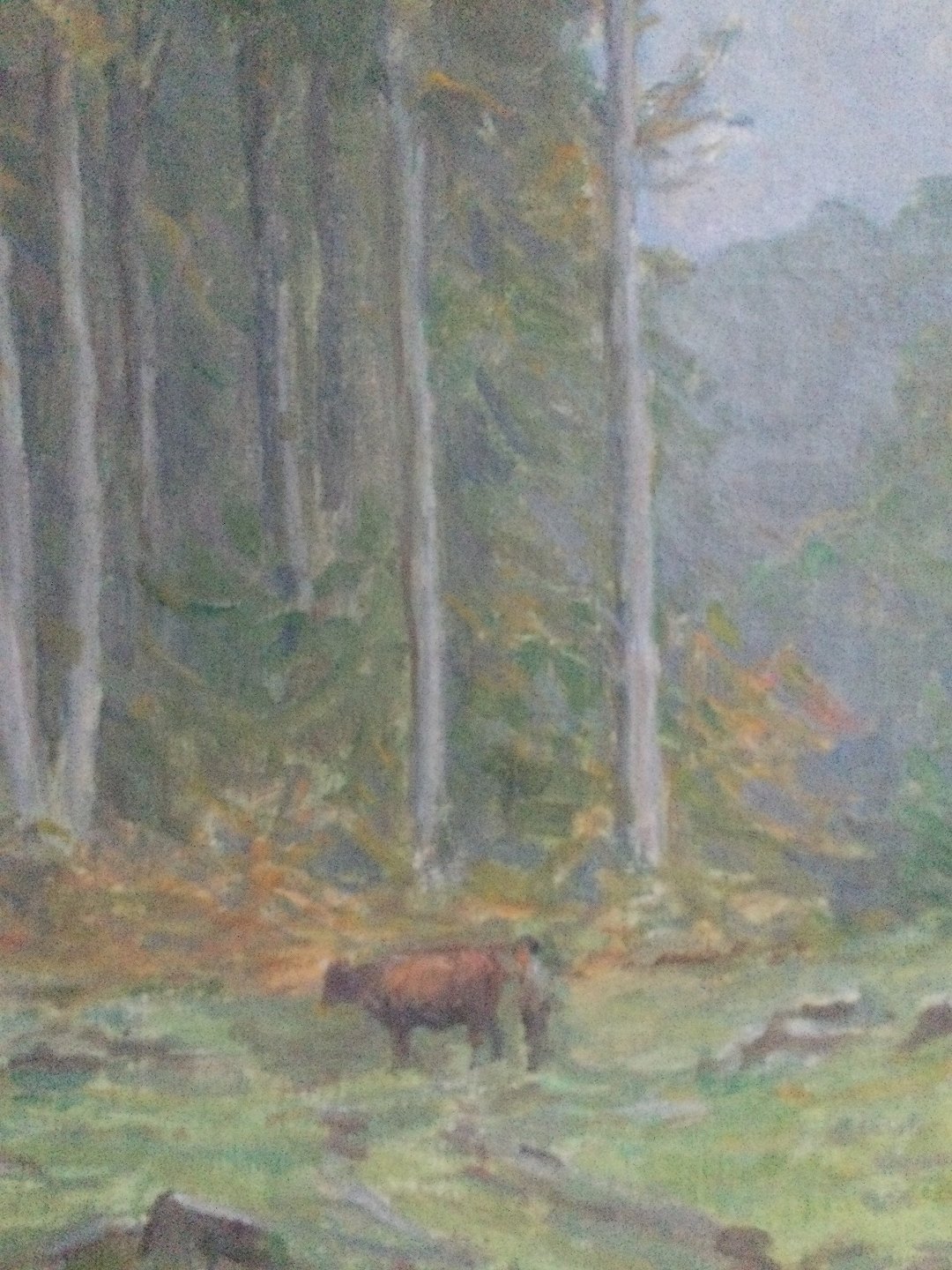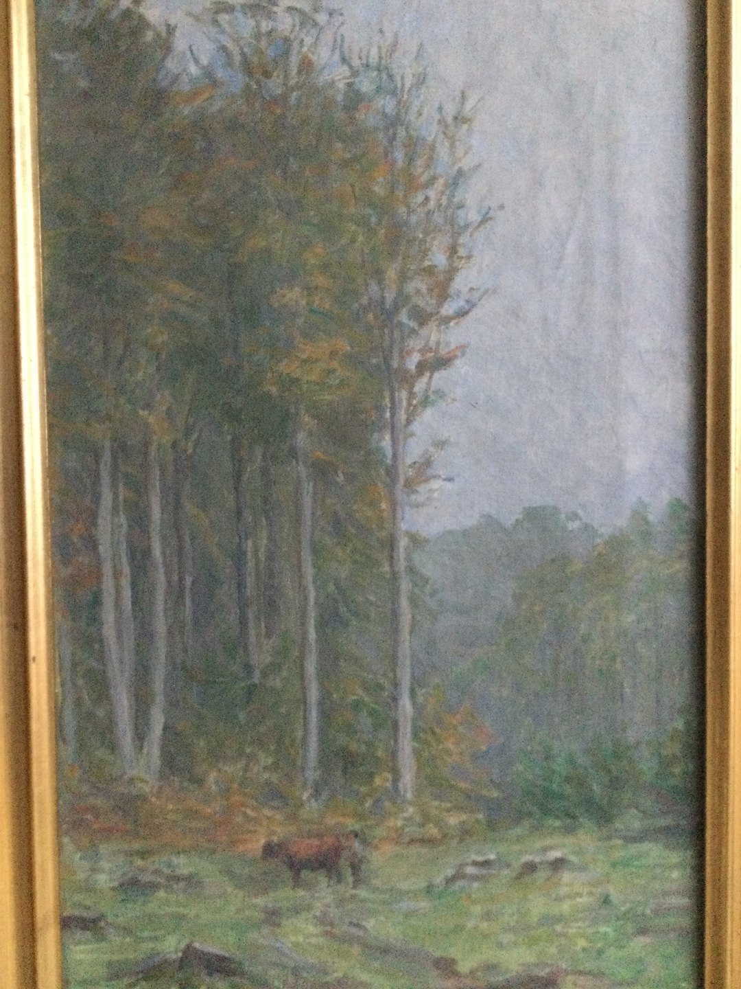 Maleri af Brita Barnekow - Skovparti med dreng og ko i lysning 1919.