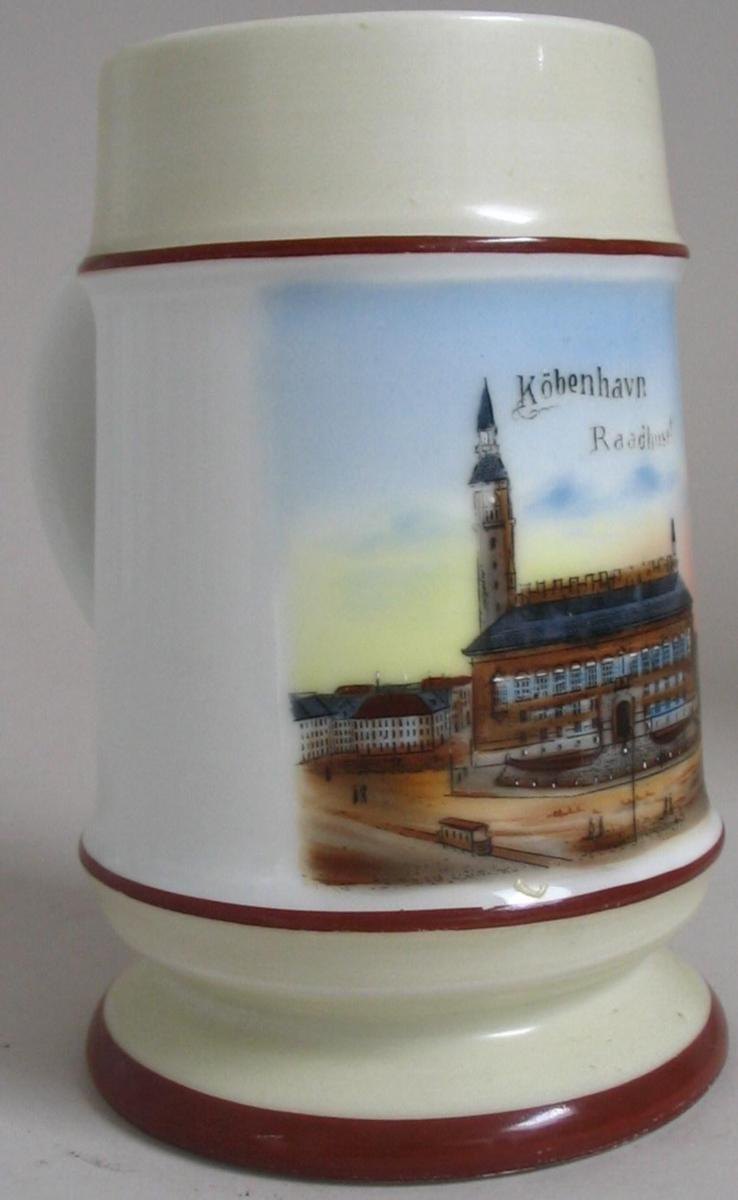 Porcelæns krus, o. 1900, souvenier, med Københavns Rådhus som motiv i overføringsteknik, fremstillet i Tyskland. 1/4 liter. I bunden gennemsigtigt motiv med en tysk bonde, dennes kone og datter. H.: 12 cm.