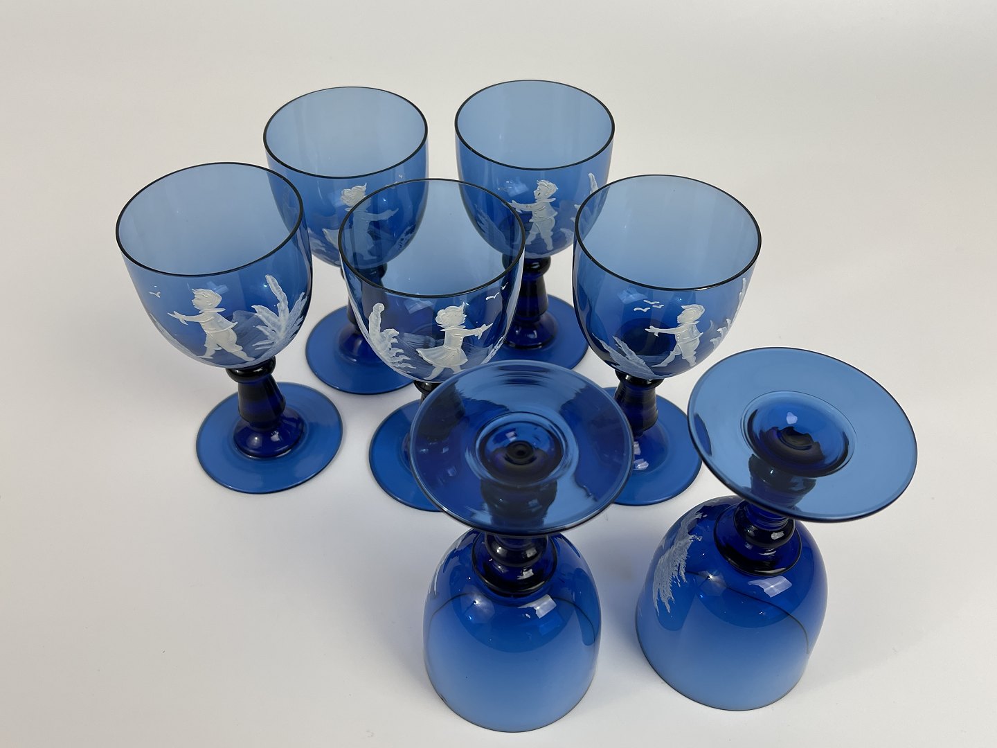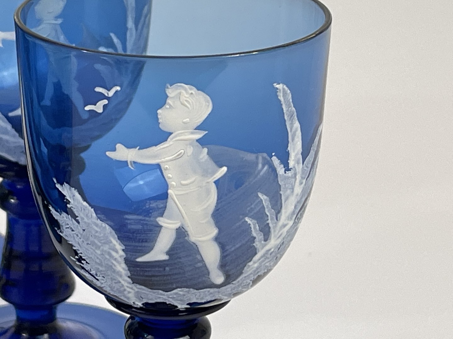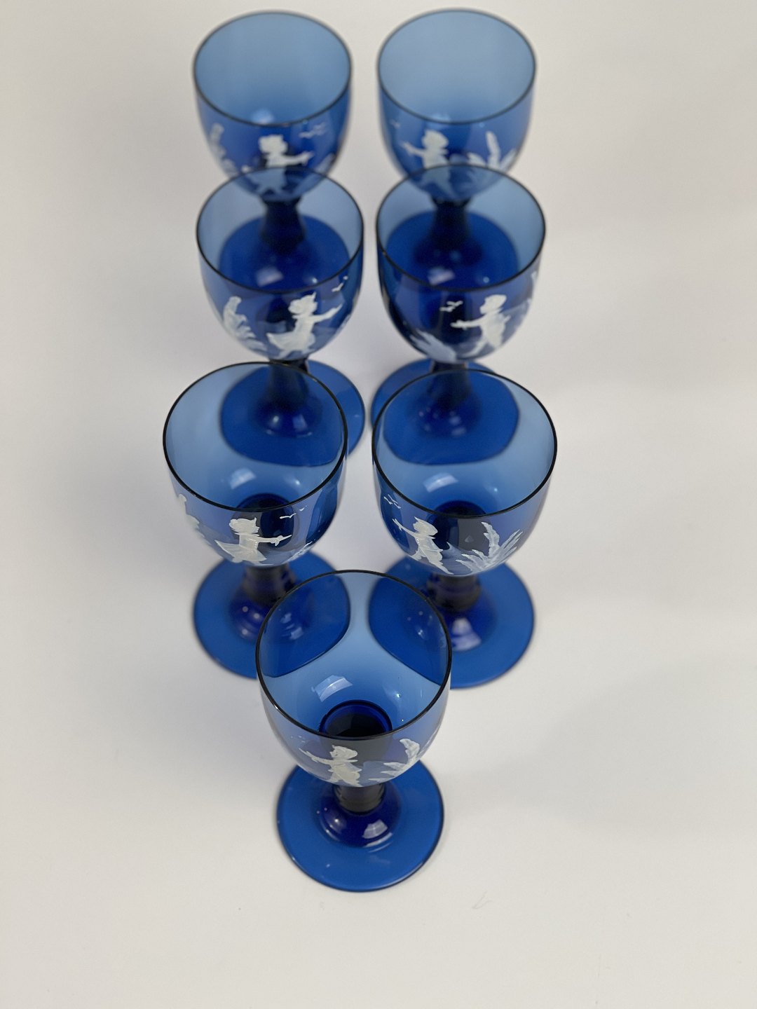 Sæt med 7 Mary Gregory hvidvinsglas i koboltblå med malet motiv i hvidt med piger på tre af glassene og drenge på 4 af vinglassene. Drengen/pigen er fascineret af fuglene og prøver at følge dem. Midten af det 20. århundrede.