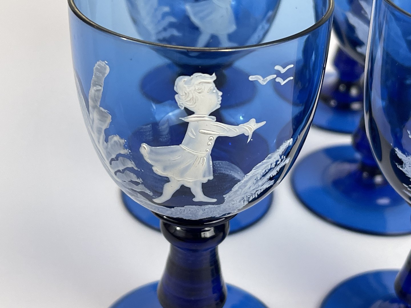 Mary Gregory koboltblå vinglas, sæt på 7 glas med motiver af dreng, pige og fugle i landskab