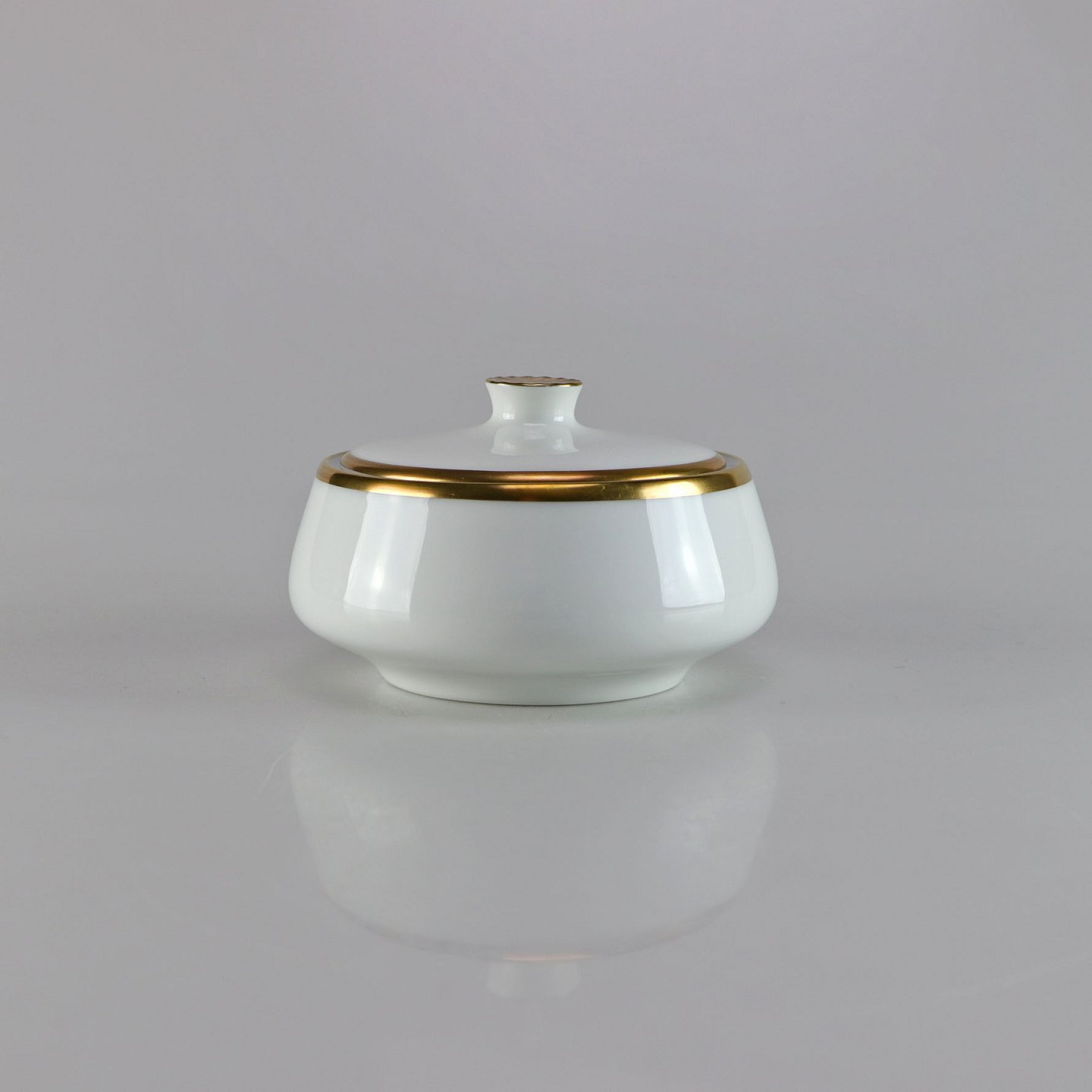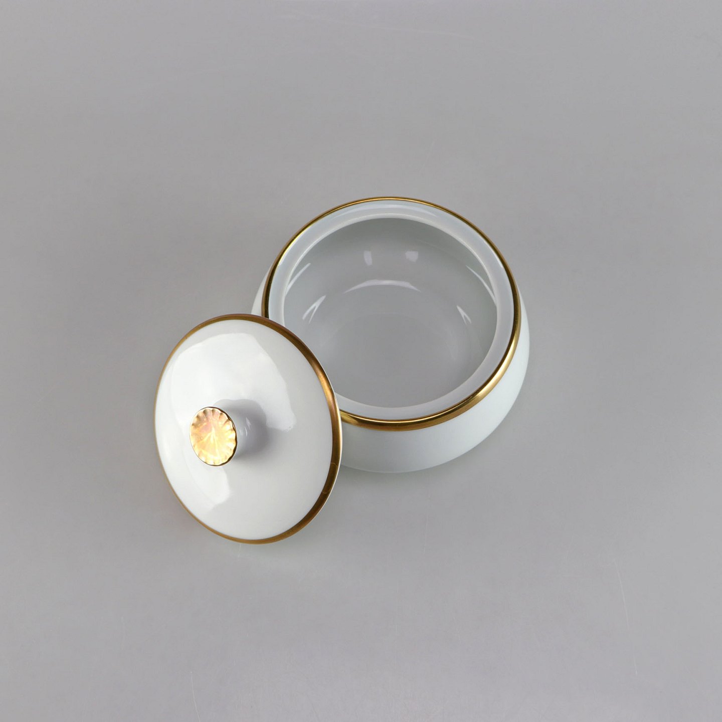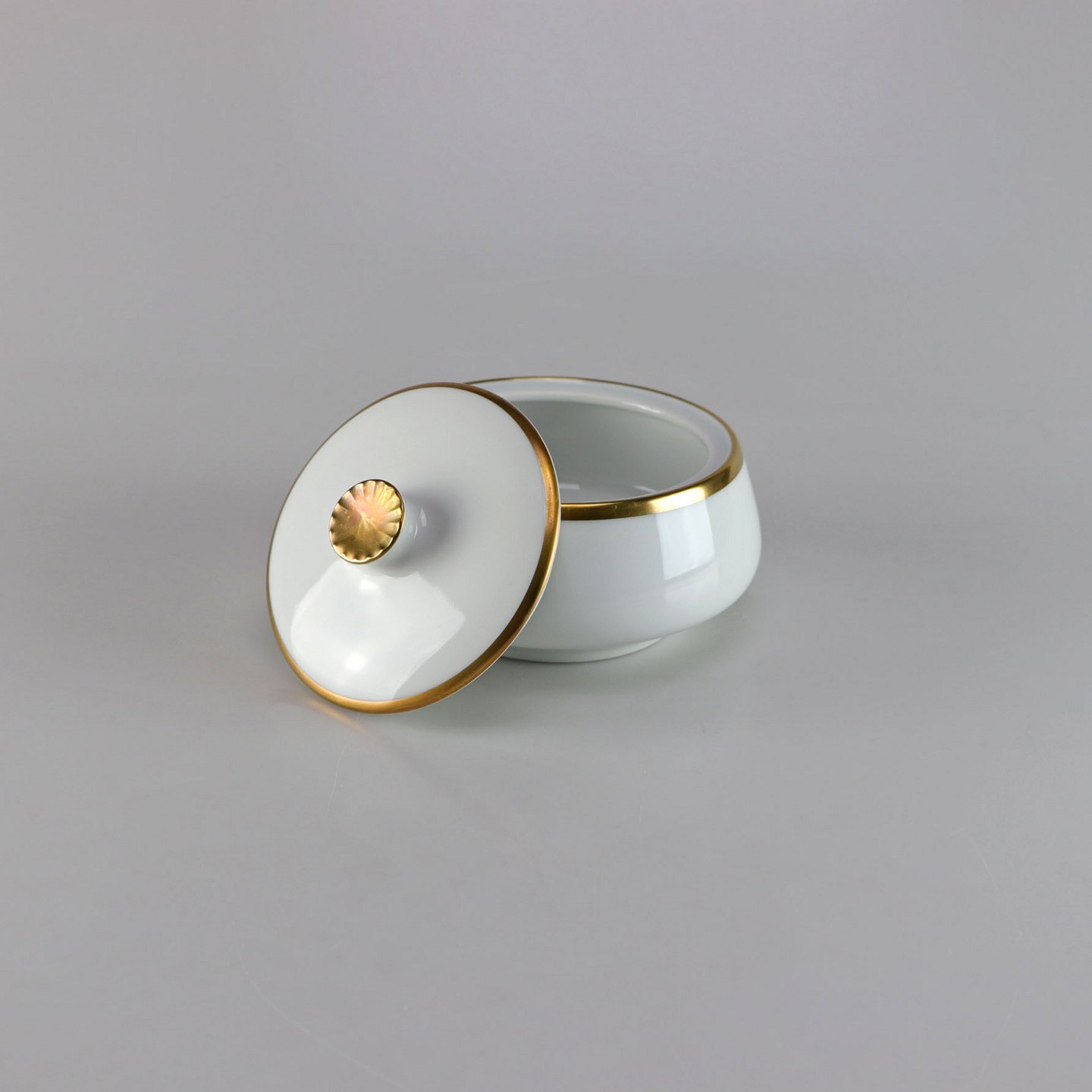 Lågkrukke i glat hvidt porcelæn med gylden kant