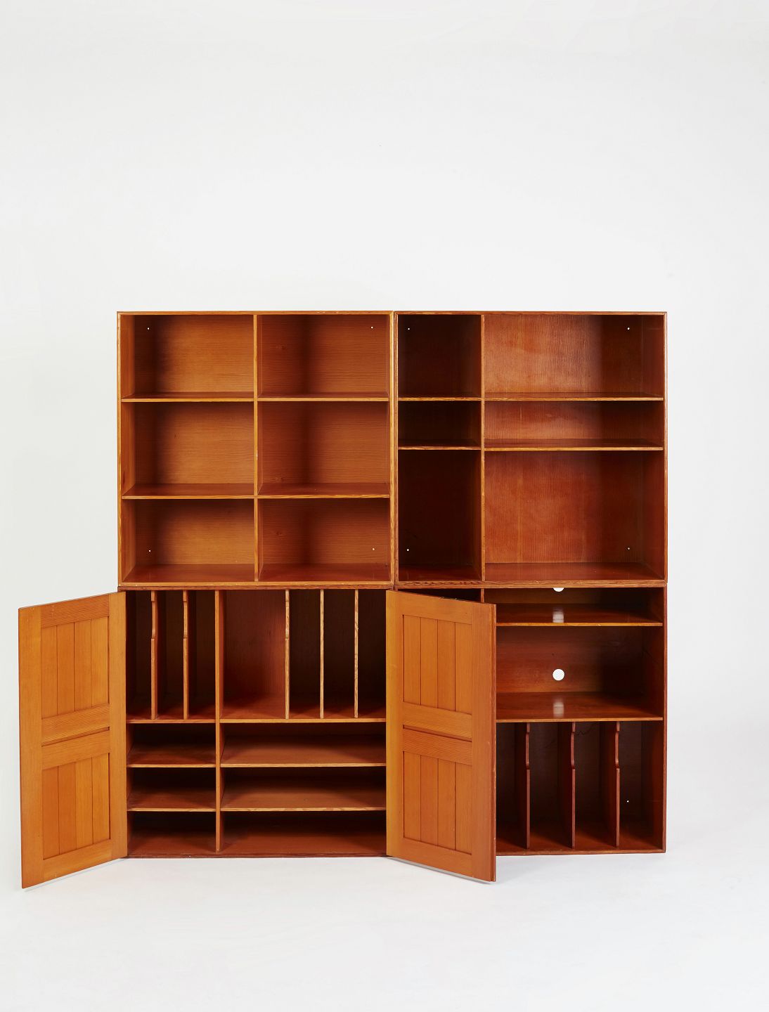 Dybe reolsektioner af massiv Oregon pine med forskellig hyldeinddeling samt skab med låger og skuffer.