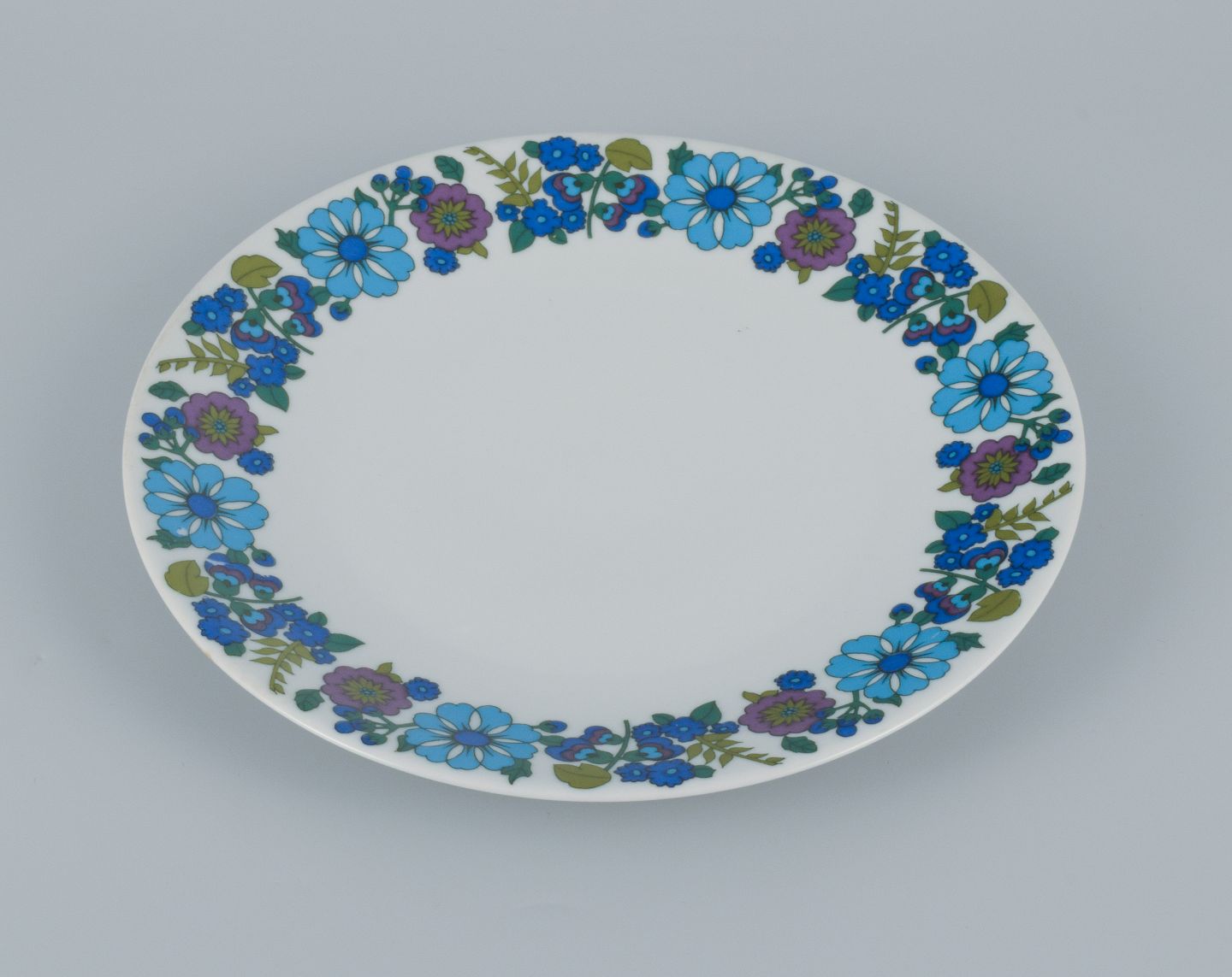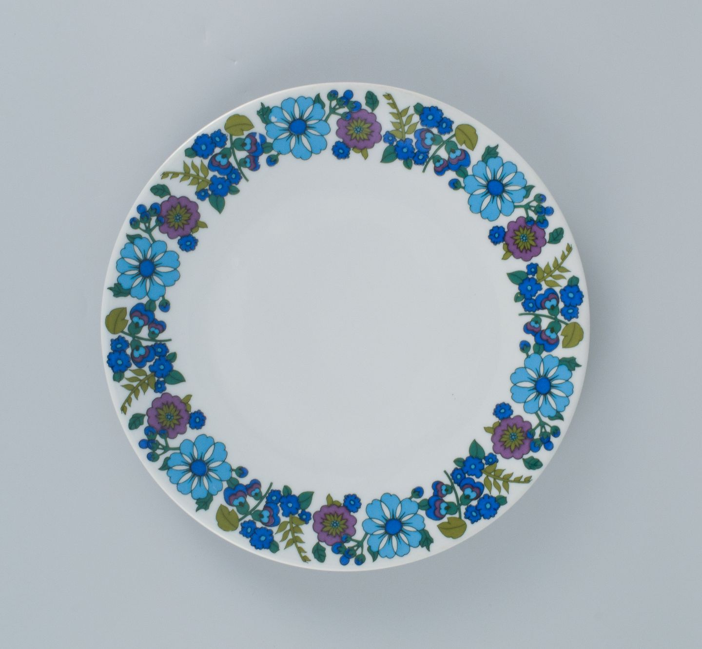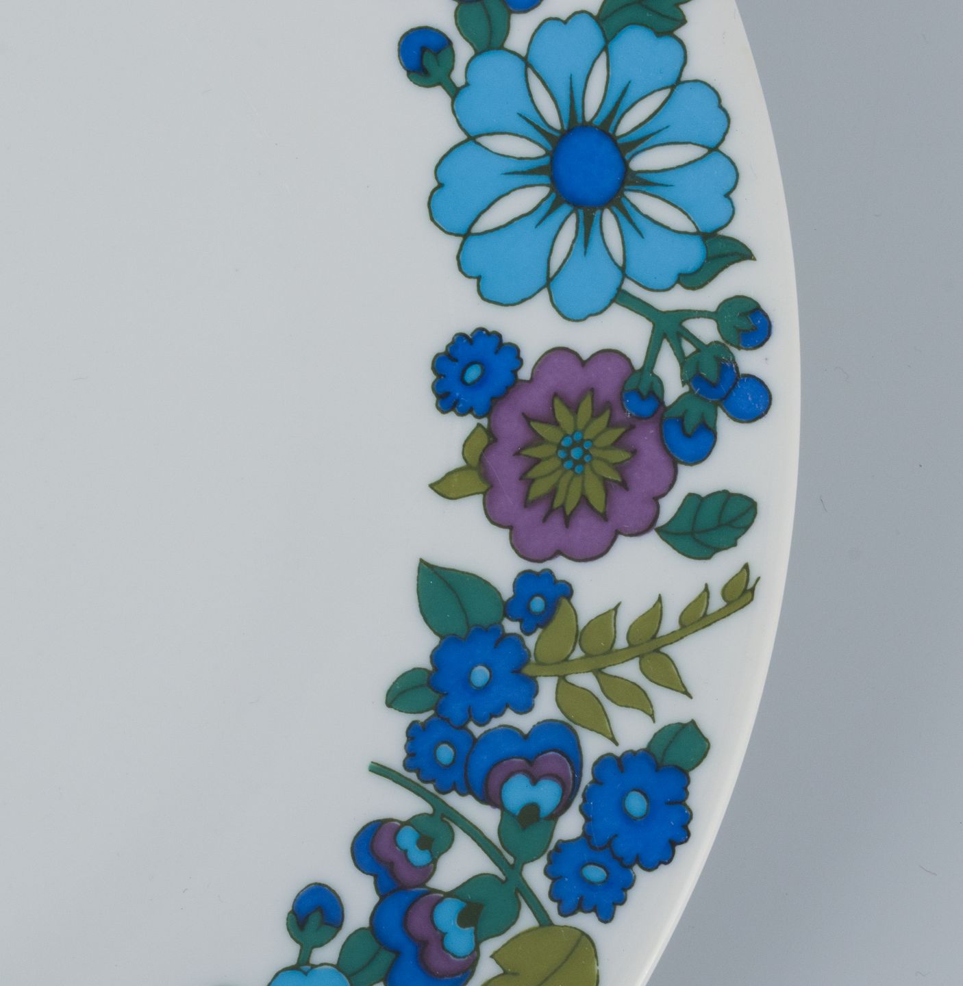 Et sæt på seks retro middagstallerkner i porcelæn med blomstermotiv.