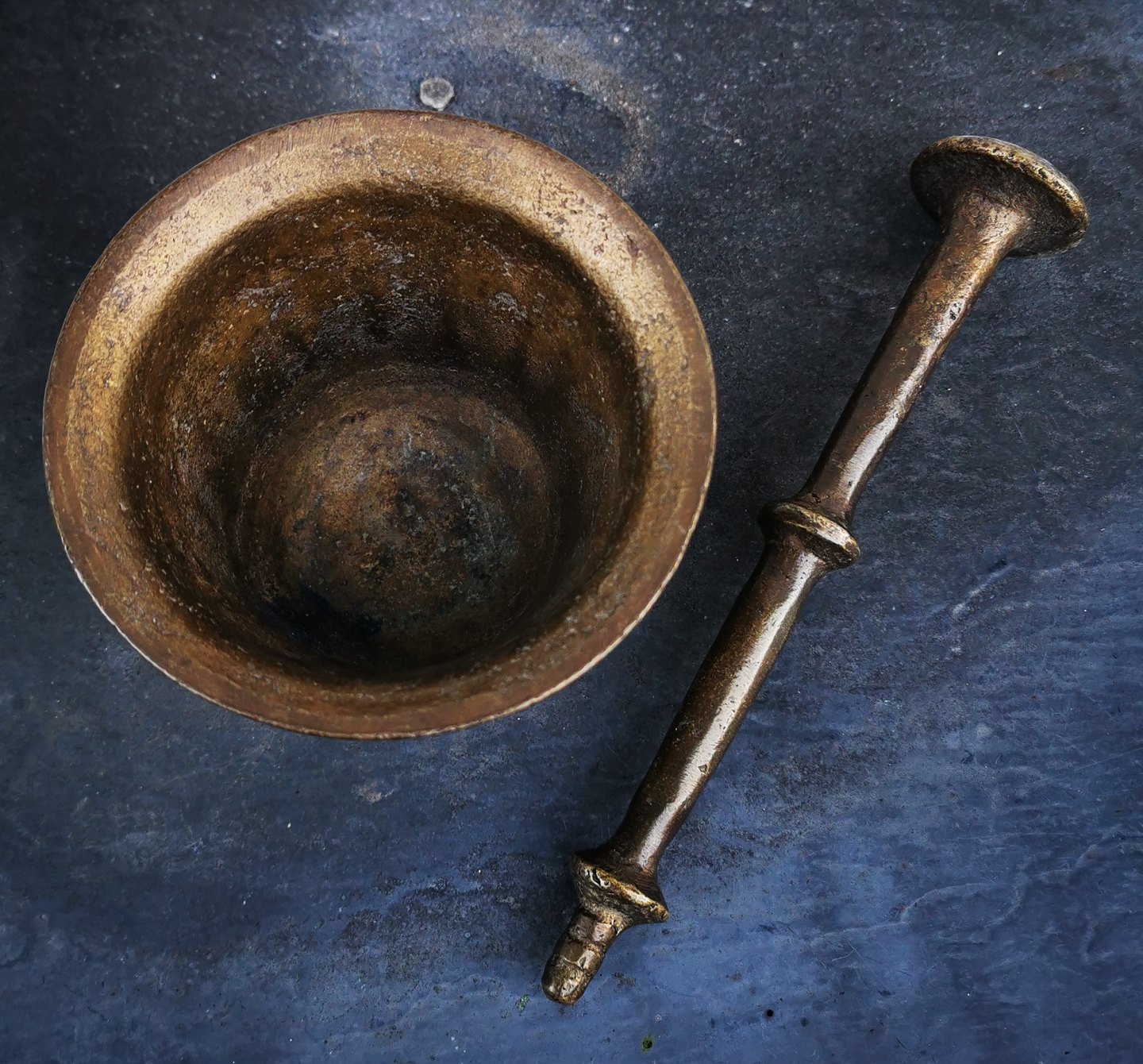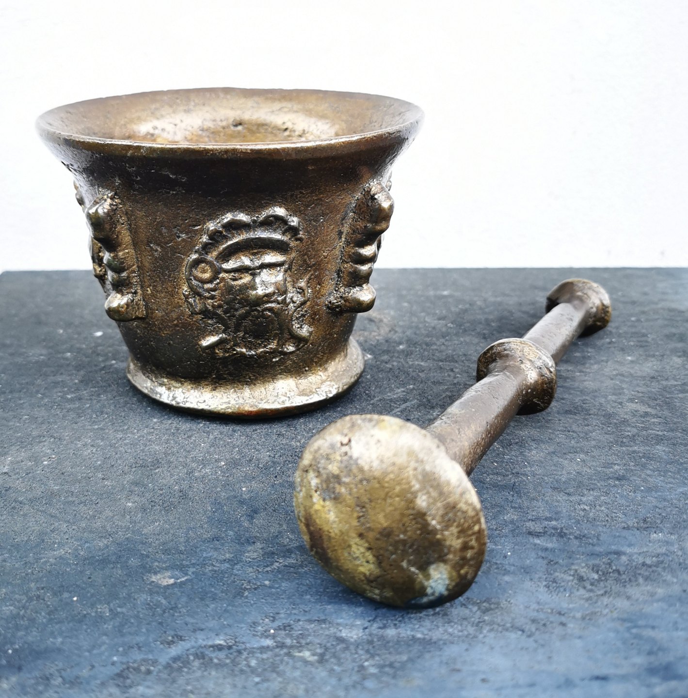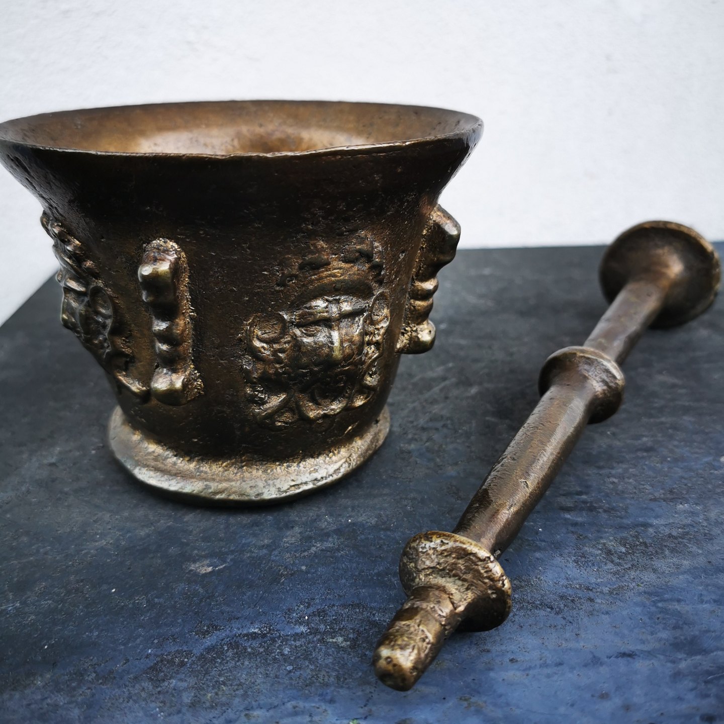 Morter i bronce med pistel. Fremstillet i Spanien. I god stand.