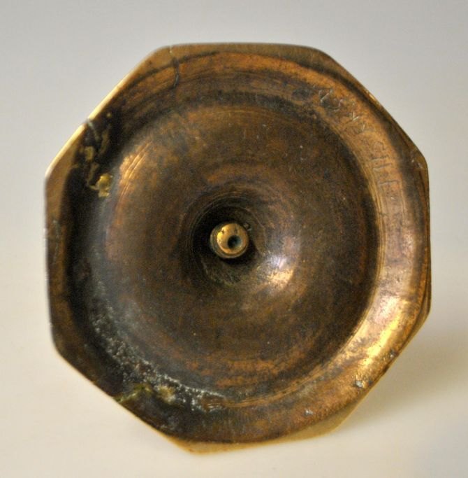Næstved brass baroque candlestick, 18th centur,y Denmark. Octagonal foot. H.: 15.2 cm. Under foot engraving: MIS.RK. SD