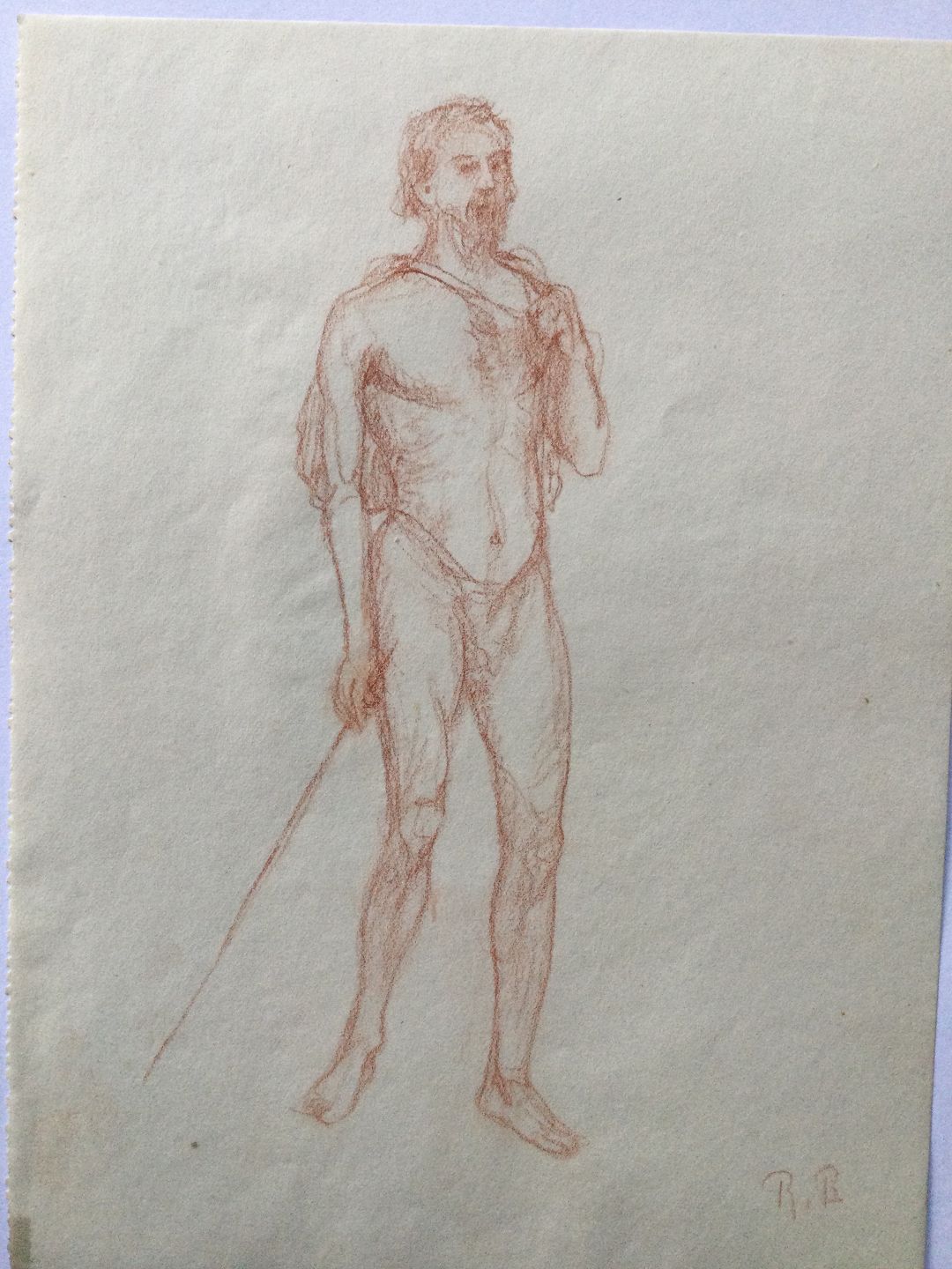 Tegning af Robert Büchtger - Gående mand med lændeklæde og stav.