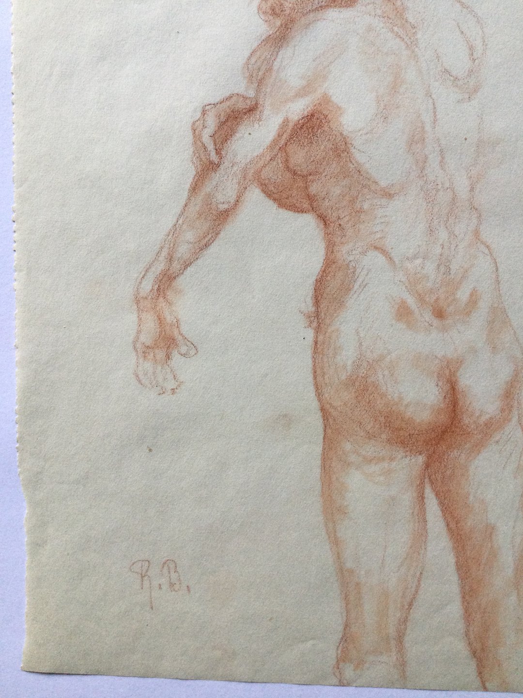 Tegning af Robert Büchtger - Gammel nøgen mand set bagfra.