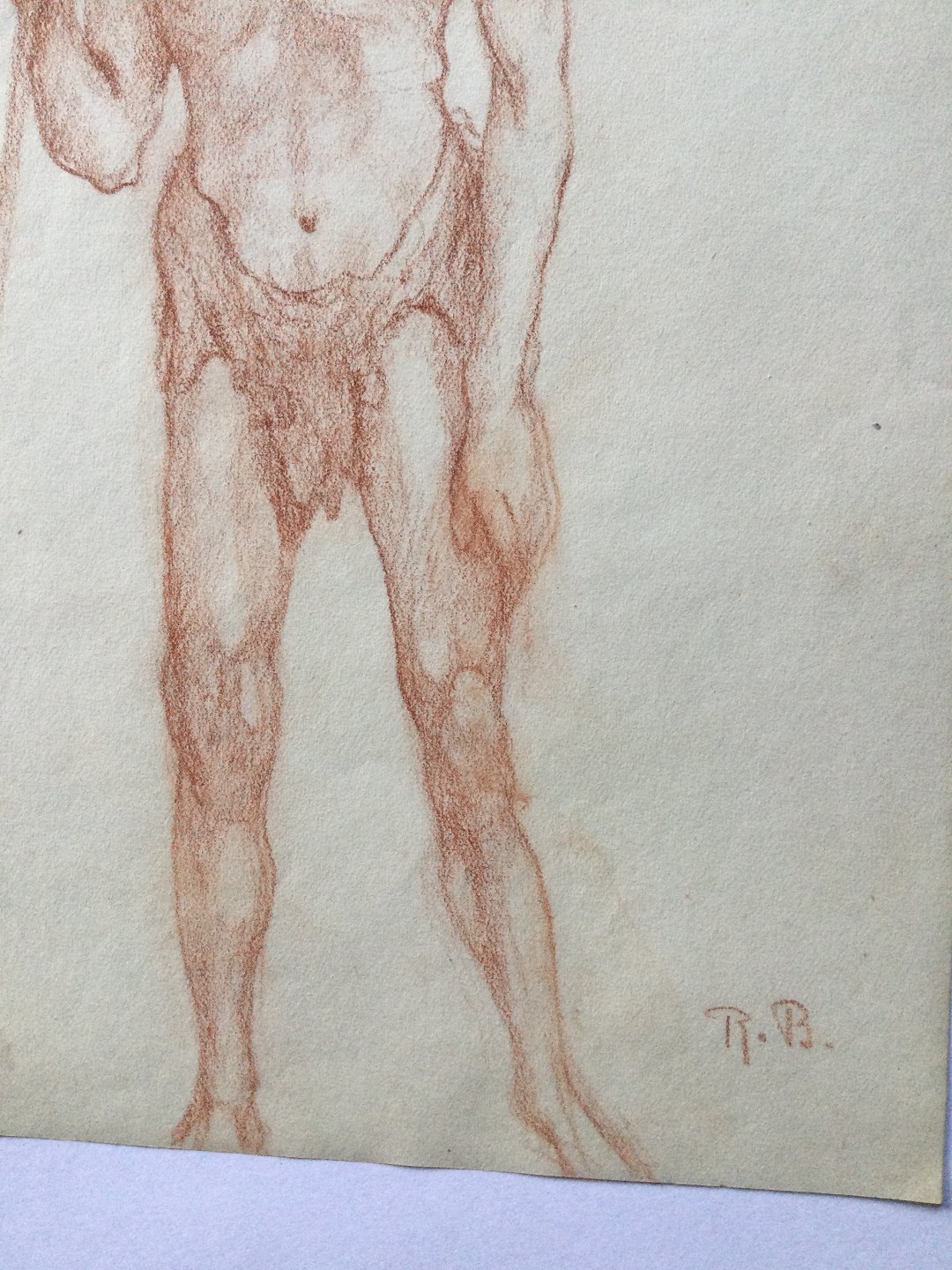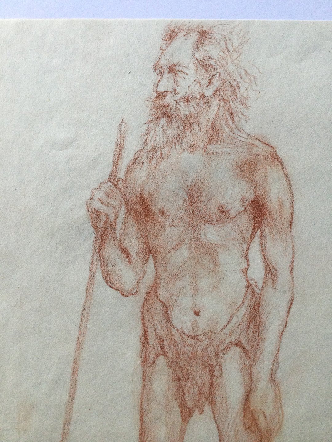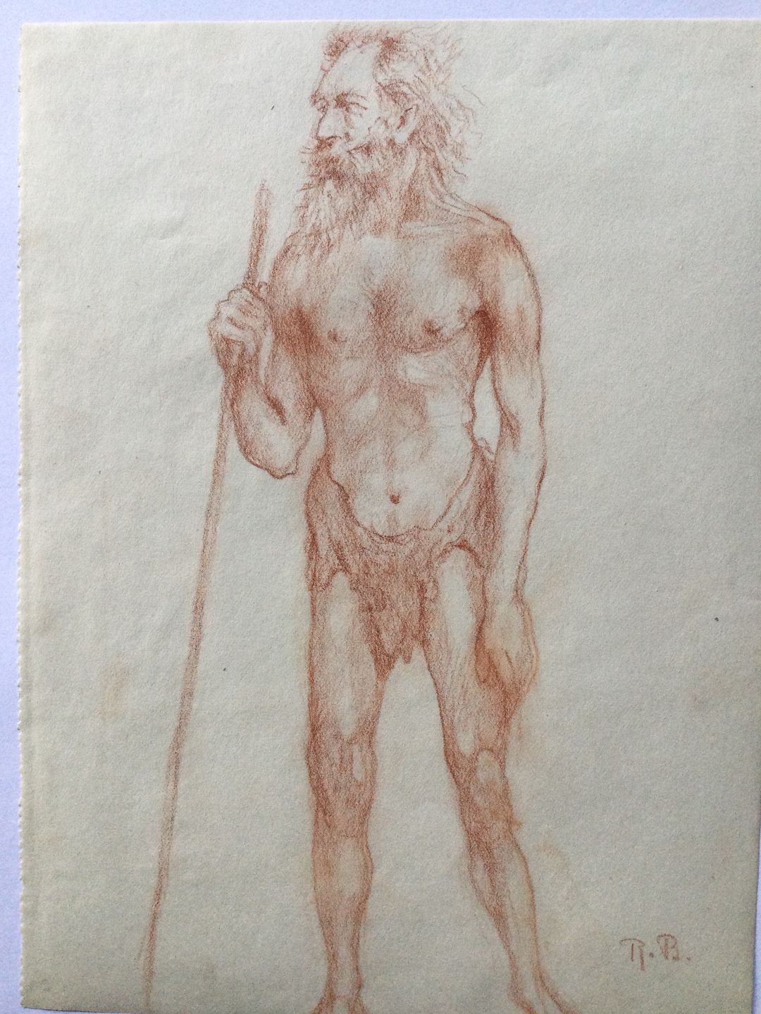 Tegning af Robert Büchtger - Gammel mand med lændeklæde og stav.
