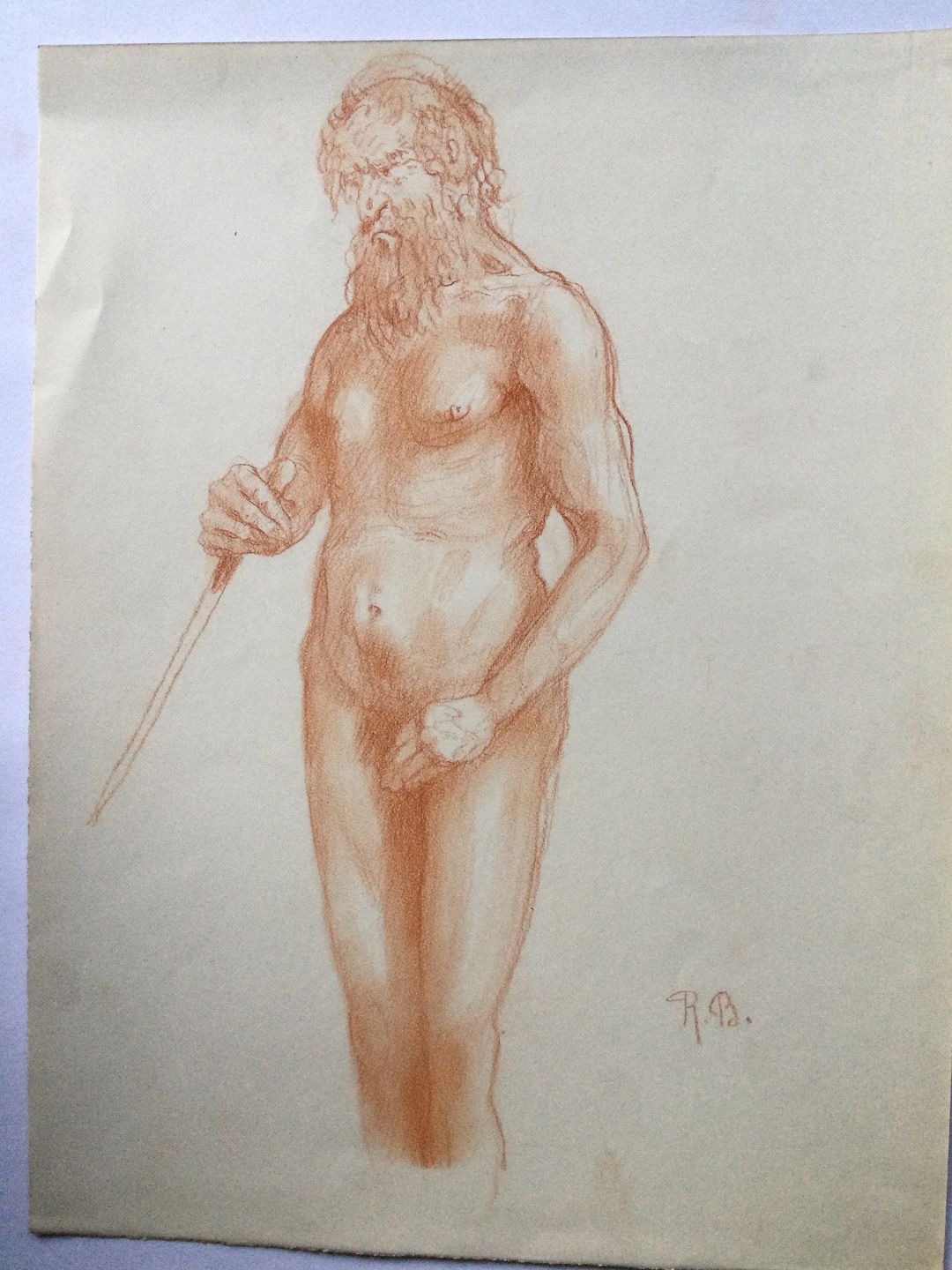 Tegning af Robert Büchtger - Gammel, nøgen mand med stav.