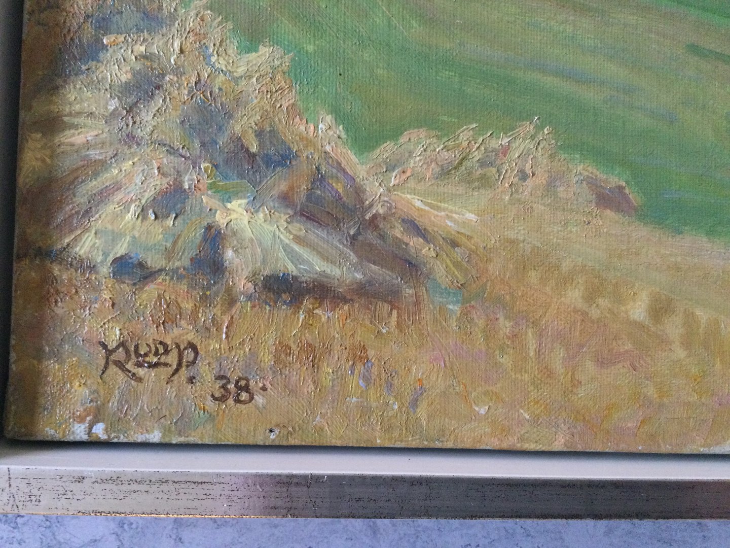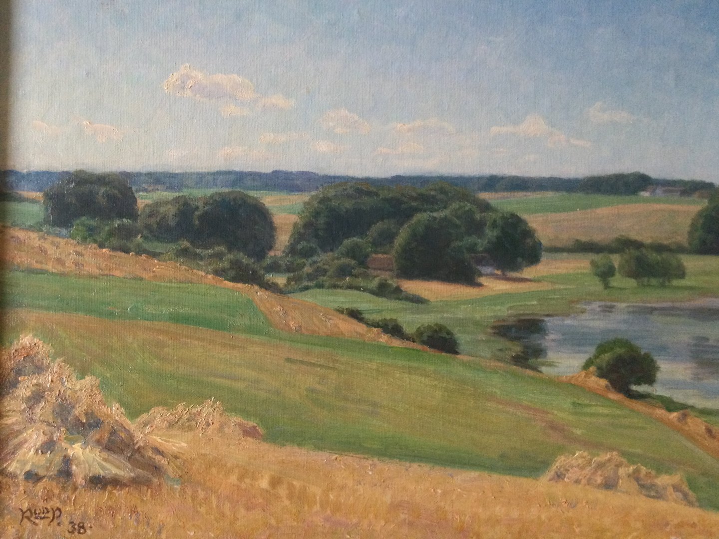 Maleri af Rud-Petersen - Gård i landskab 1938.