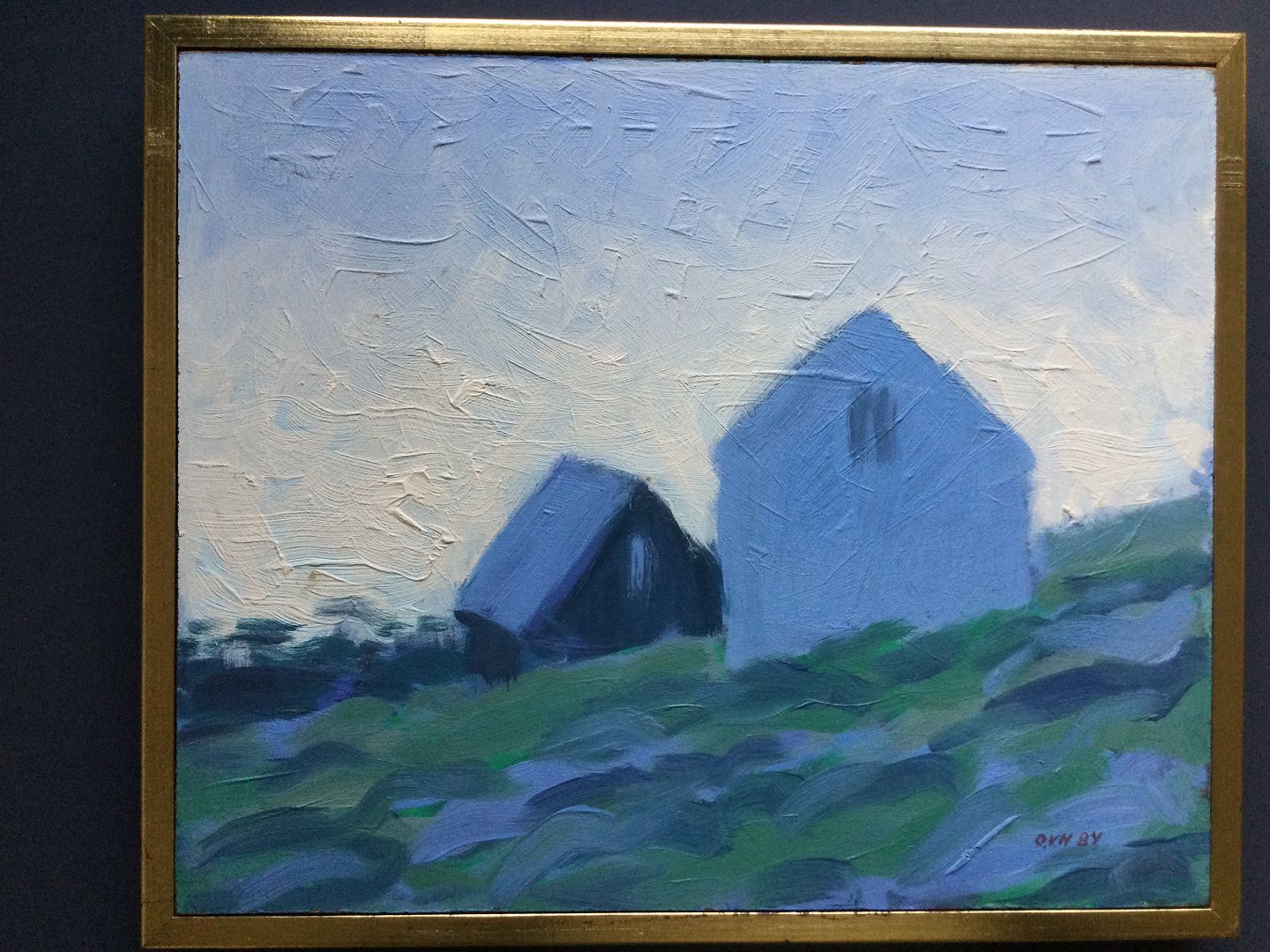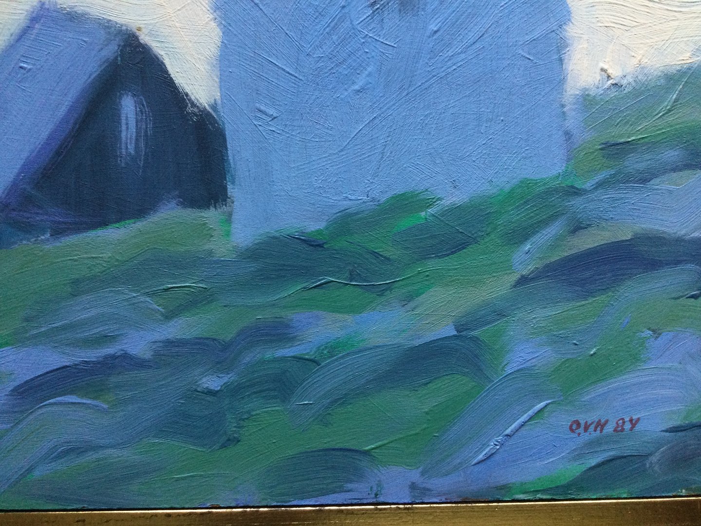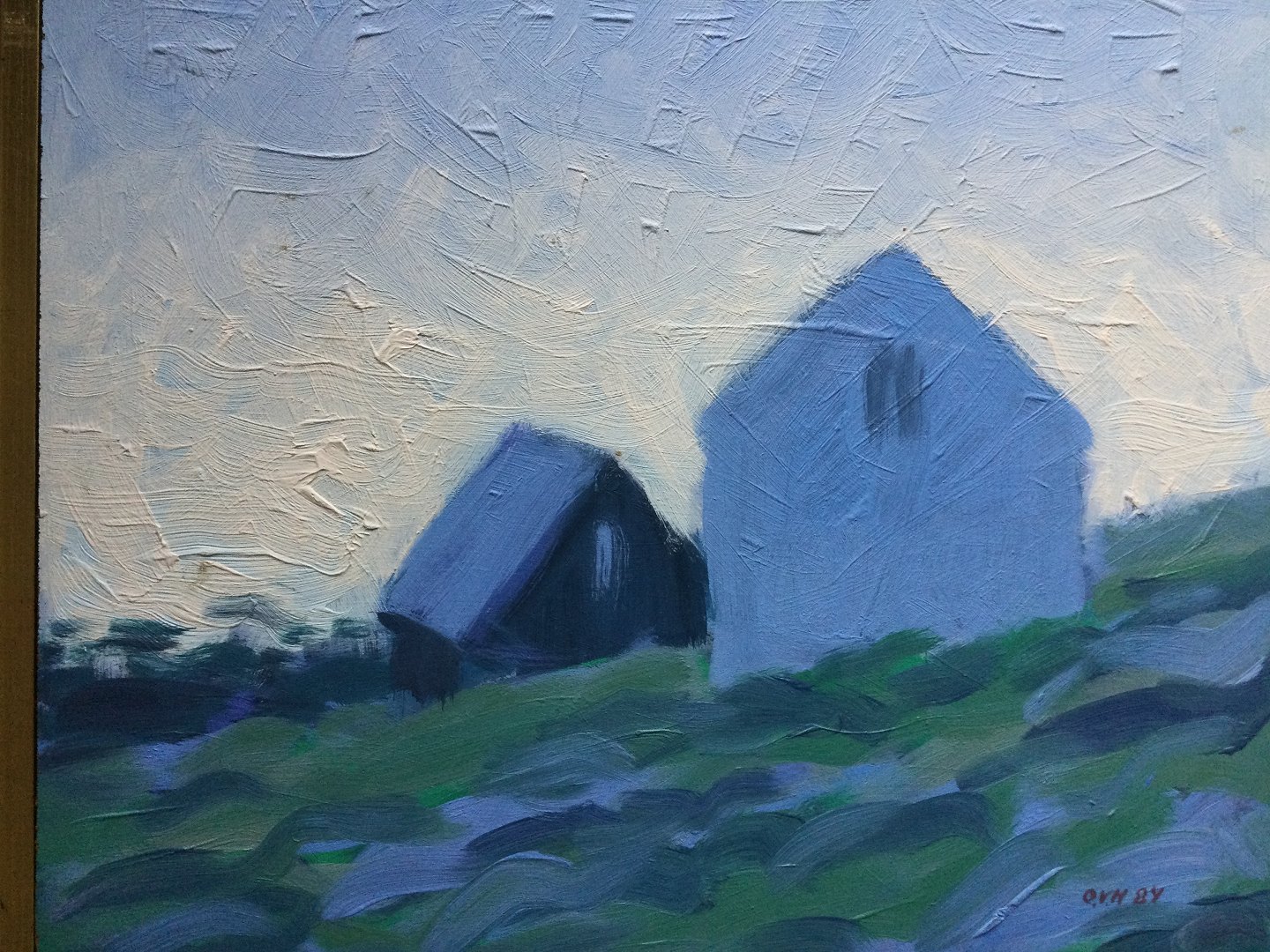 Maleri af Ole Vang Hansen - Landskab med huse fra Færørene 1984.