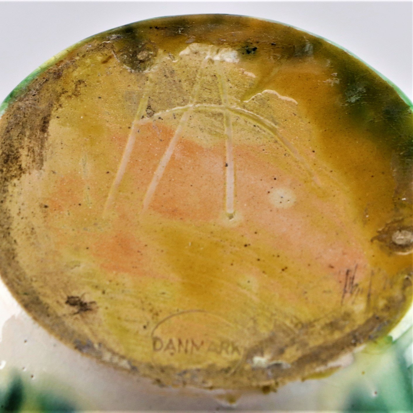 Keramikkande med hank dekoreret med påfuglefjer og blå ringe