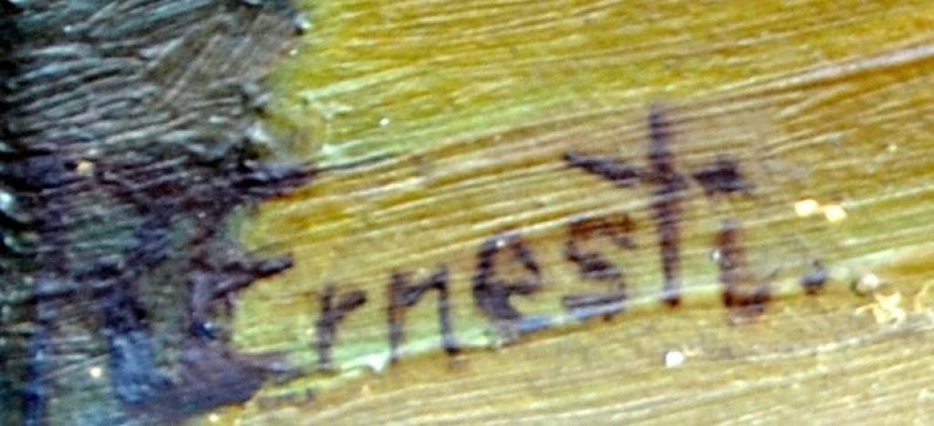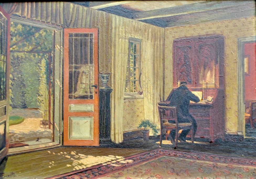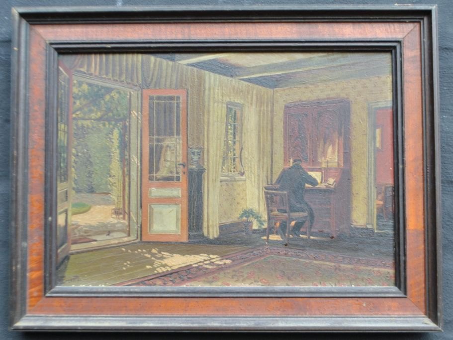 Ernesti, R. (19./20. årh) Tyskland: interiør med skrivende mand ved chatol. Signeret. Olie på malerpap. 23 x 33 cm.