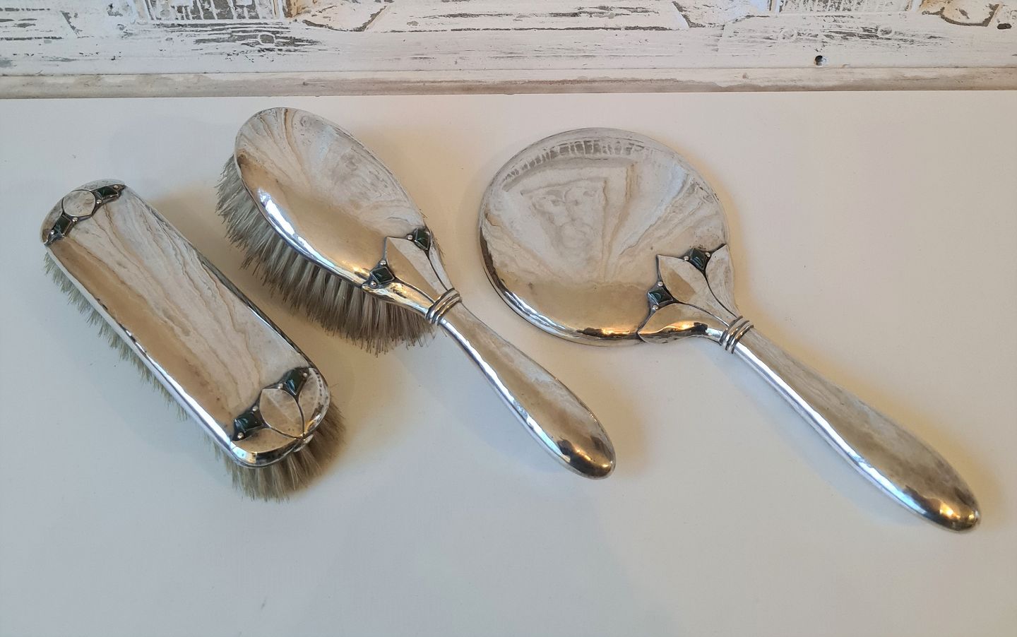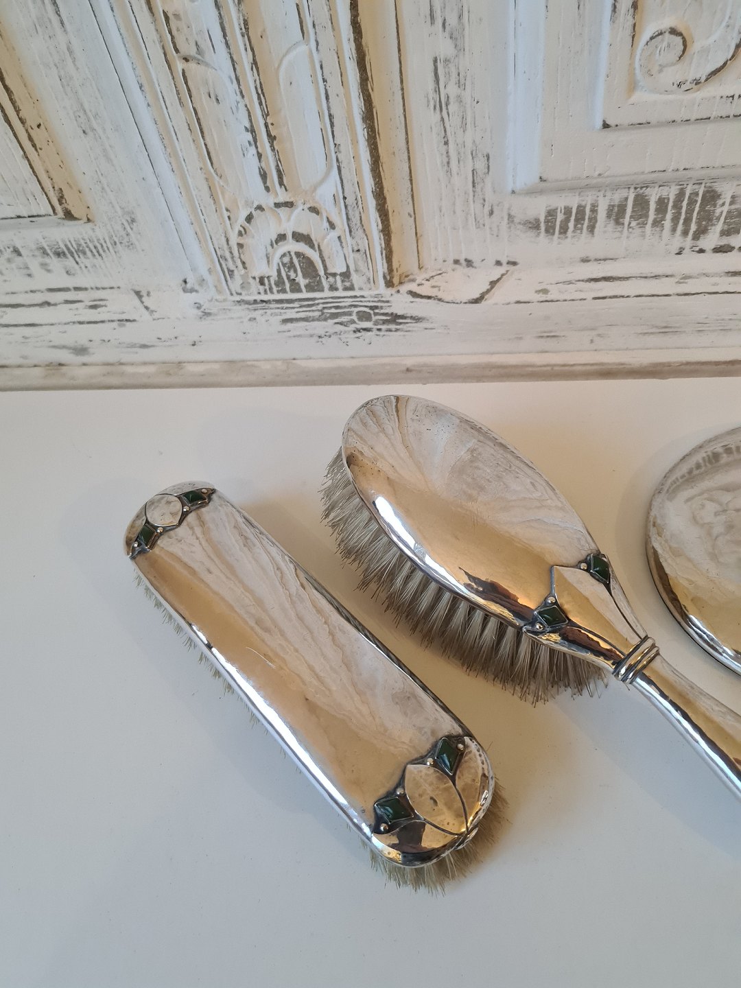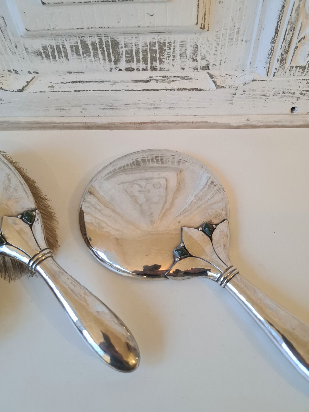 Skønvirke toiletgarniture af Emil Hansen - Odense. Sættet er produceret i sølv prydet med grønne sten - antageligt chrysopras
