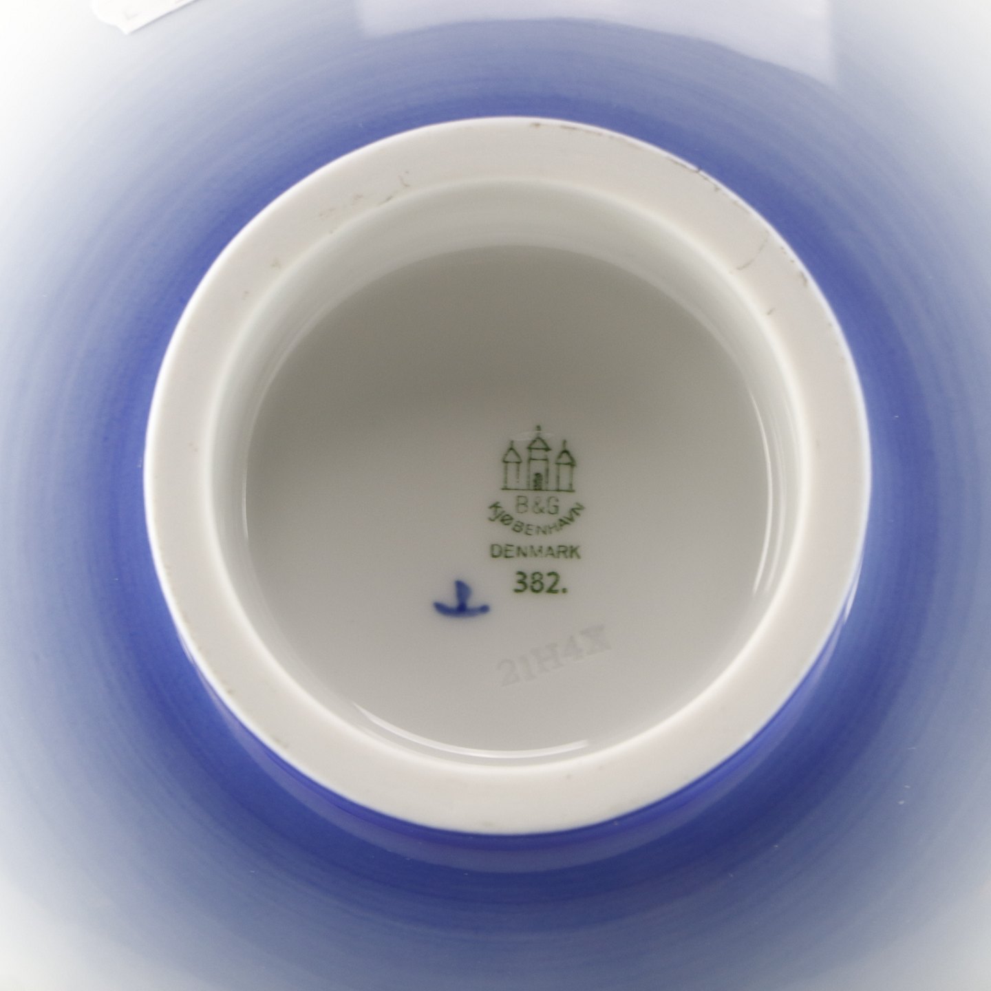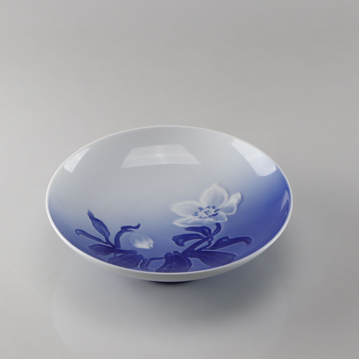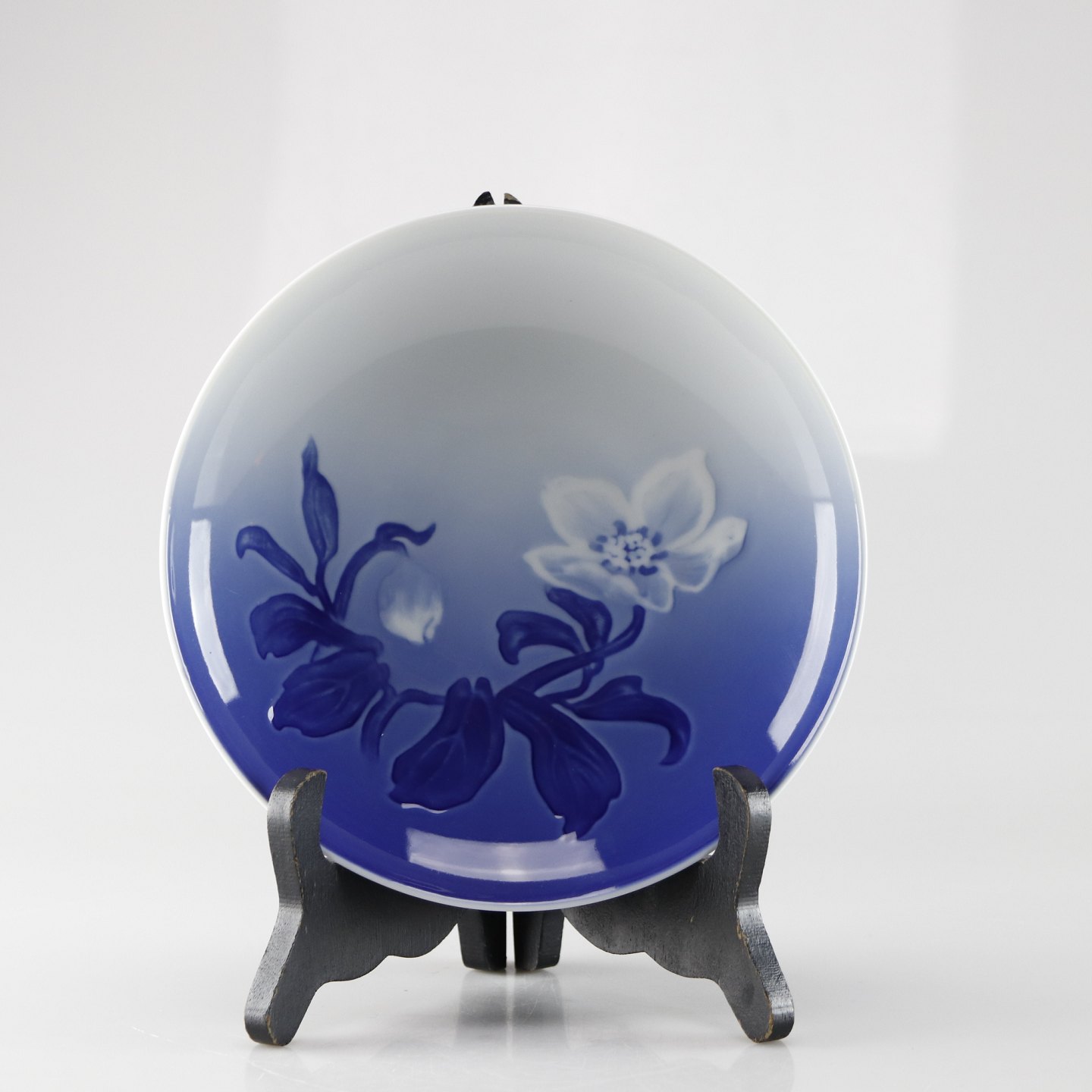 Kagefad på fod eller opsats i blå farver med et motiv af en julerose