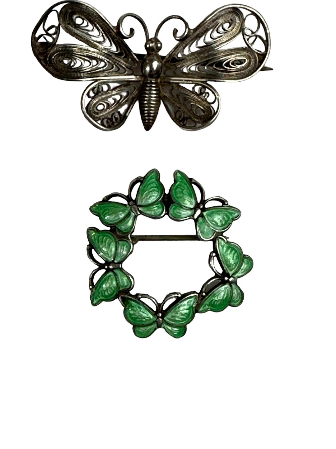 Vintage brocher med sommerfugle, sølv, herunder 925 sterlingsølv plus emalje.