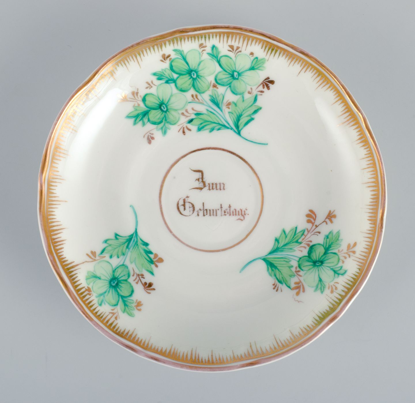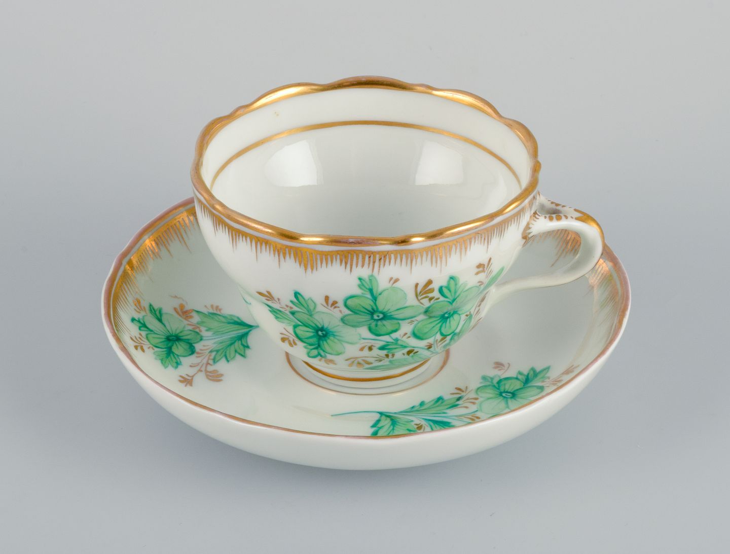 Chokoladekop håndmalet med grønne blomster og gulddekoration.