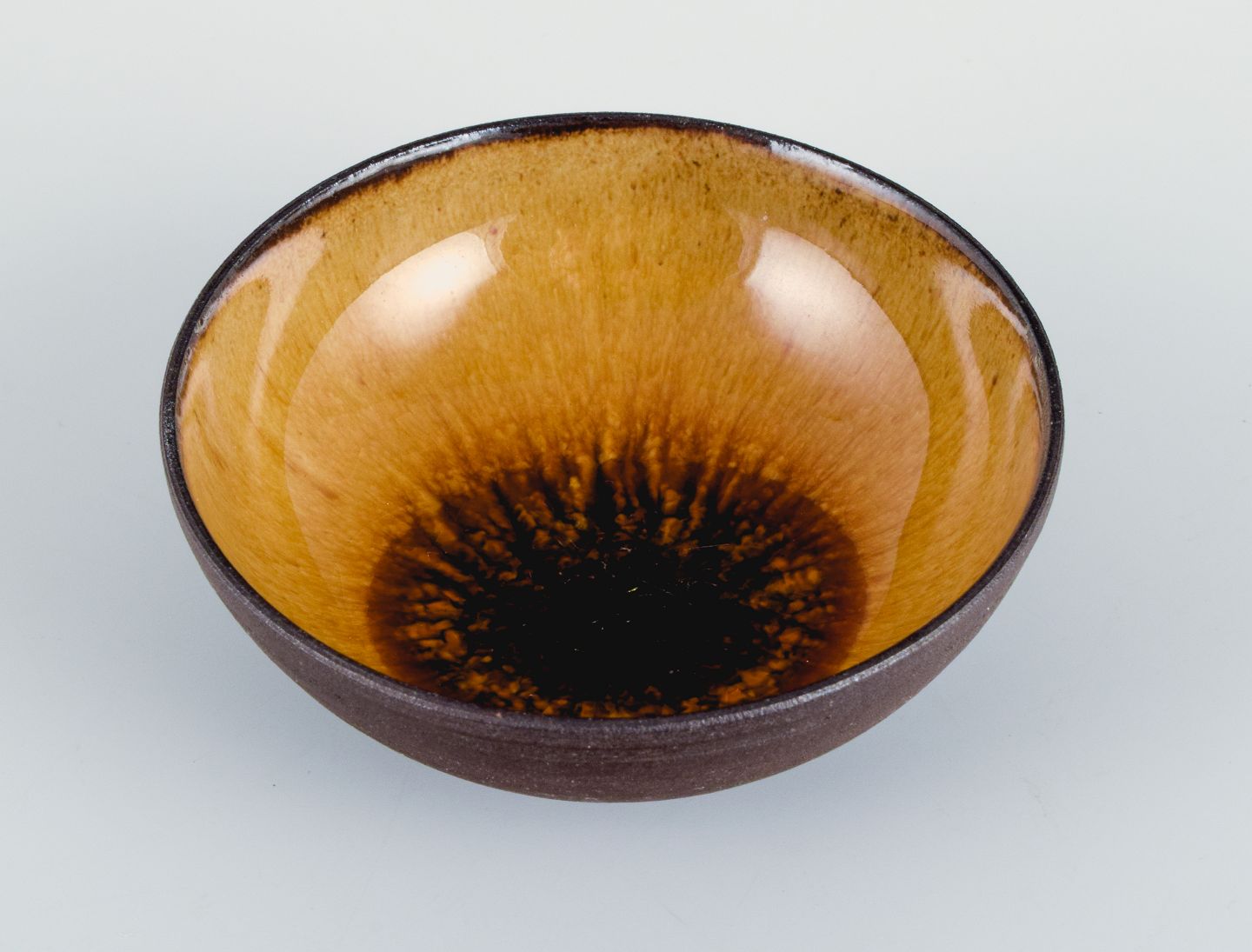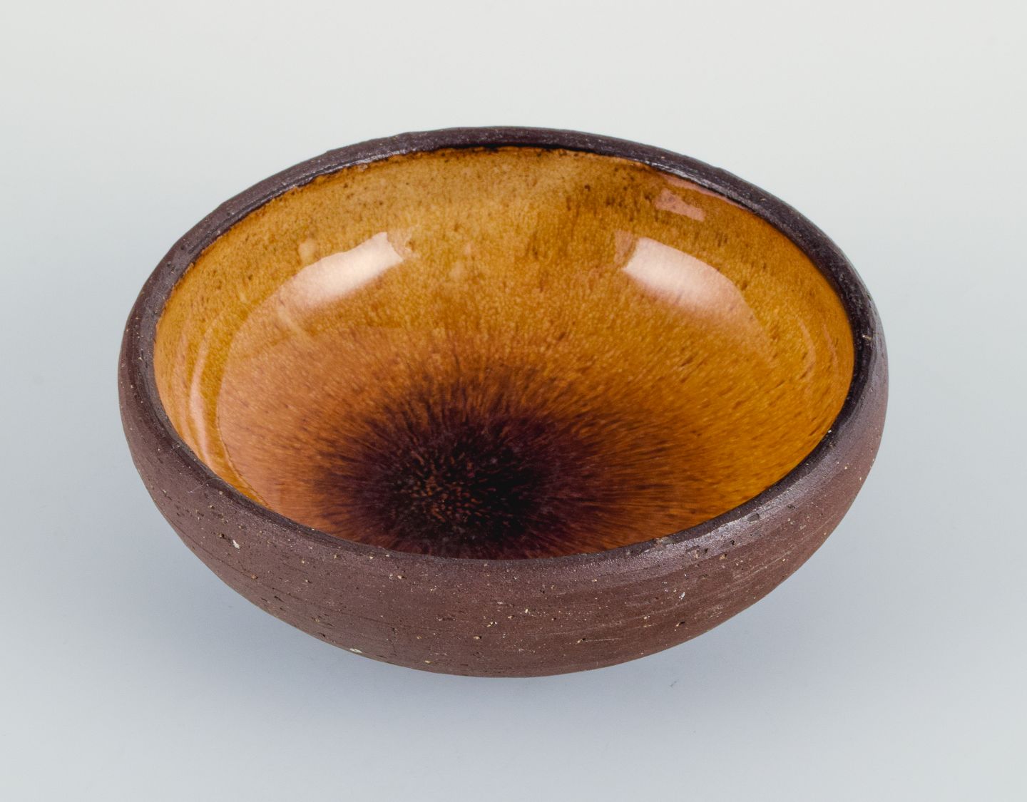 To små retro unika keramikskåle med glasur i gulbrune toner.