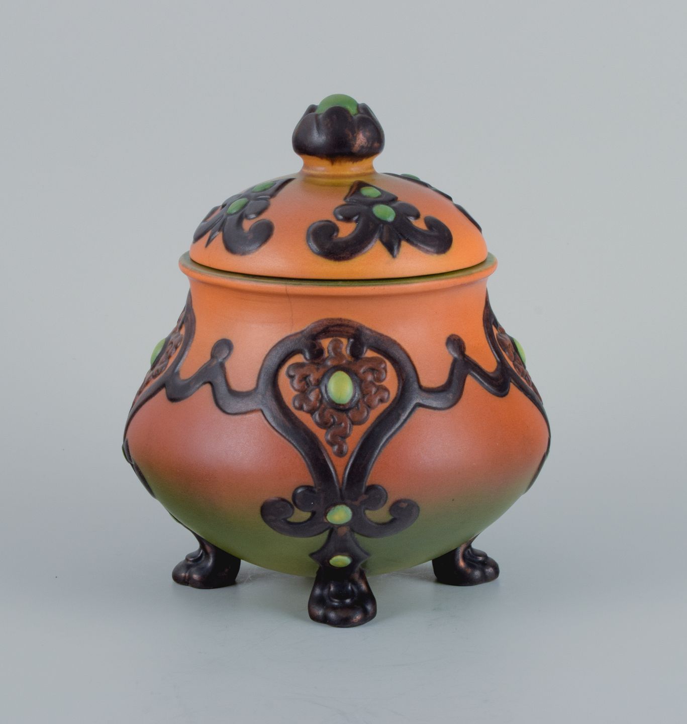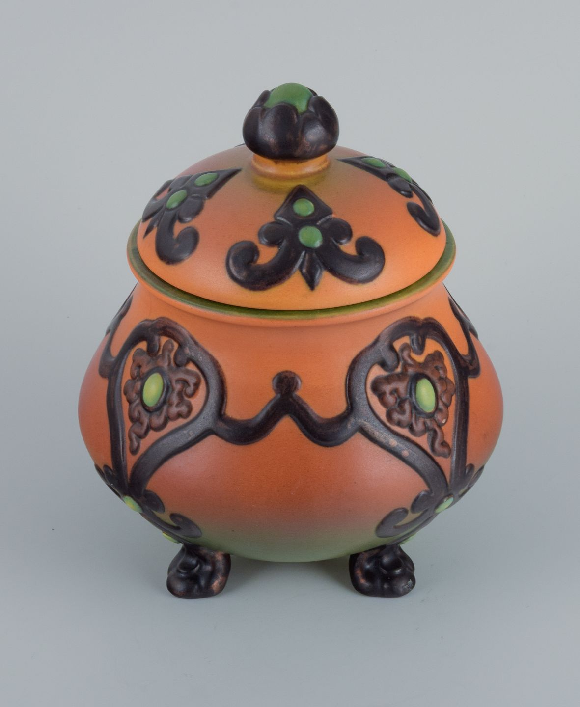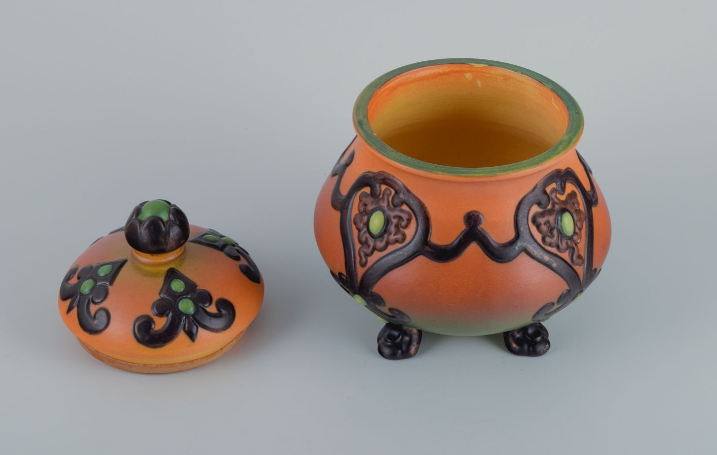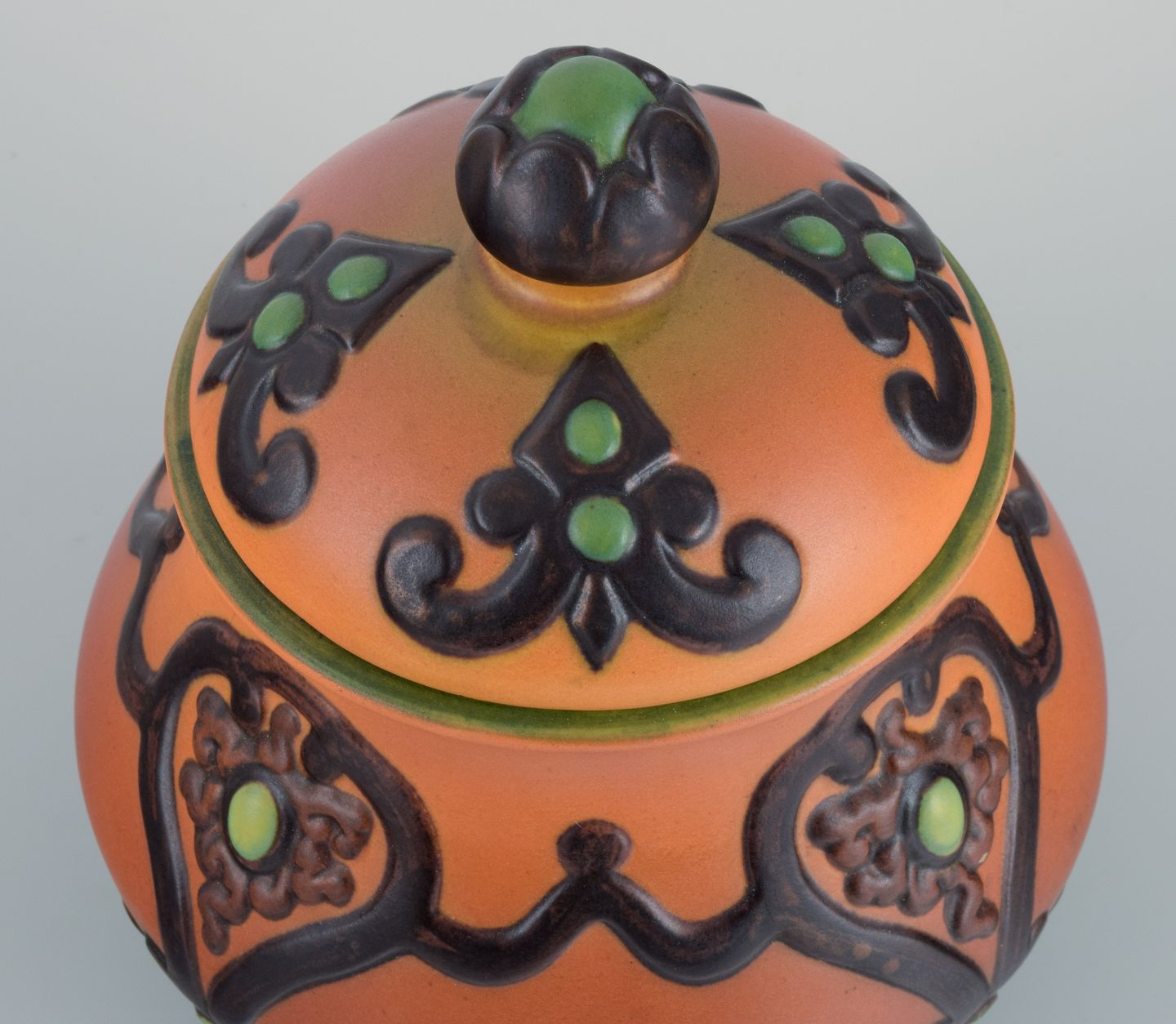 Ipsens Enke, skønvirke lågkrukke med glasur i orange og grønne toner.