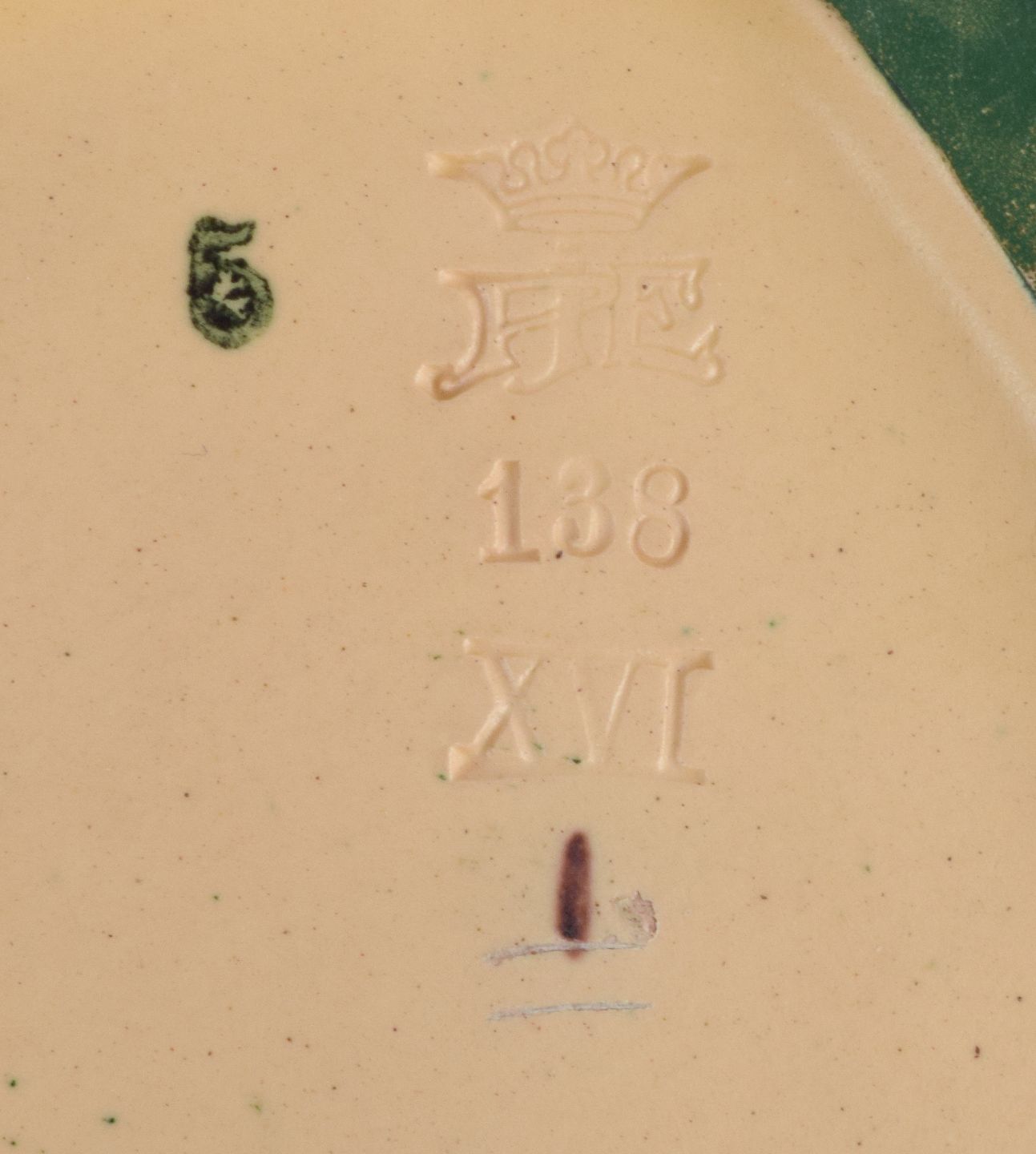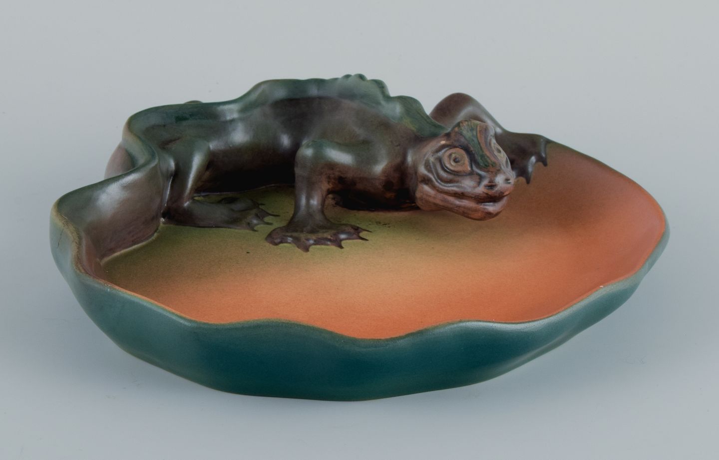 Ipsens enke, Danmark. Sjældent fad i håndmalet glaseret keramik modelleret med øgle.
