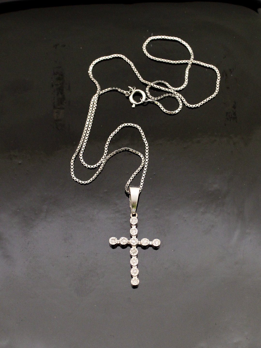 14 karat hvidguld kors med zirkoner 2,6 x 1,8 cm. og 8 karat kæde 40 cm. emne nr. 528868