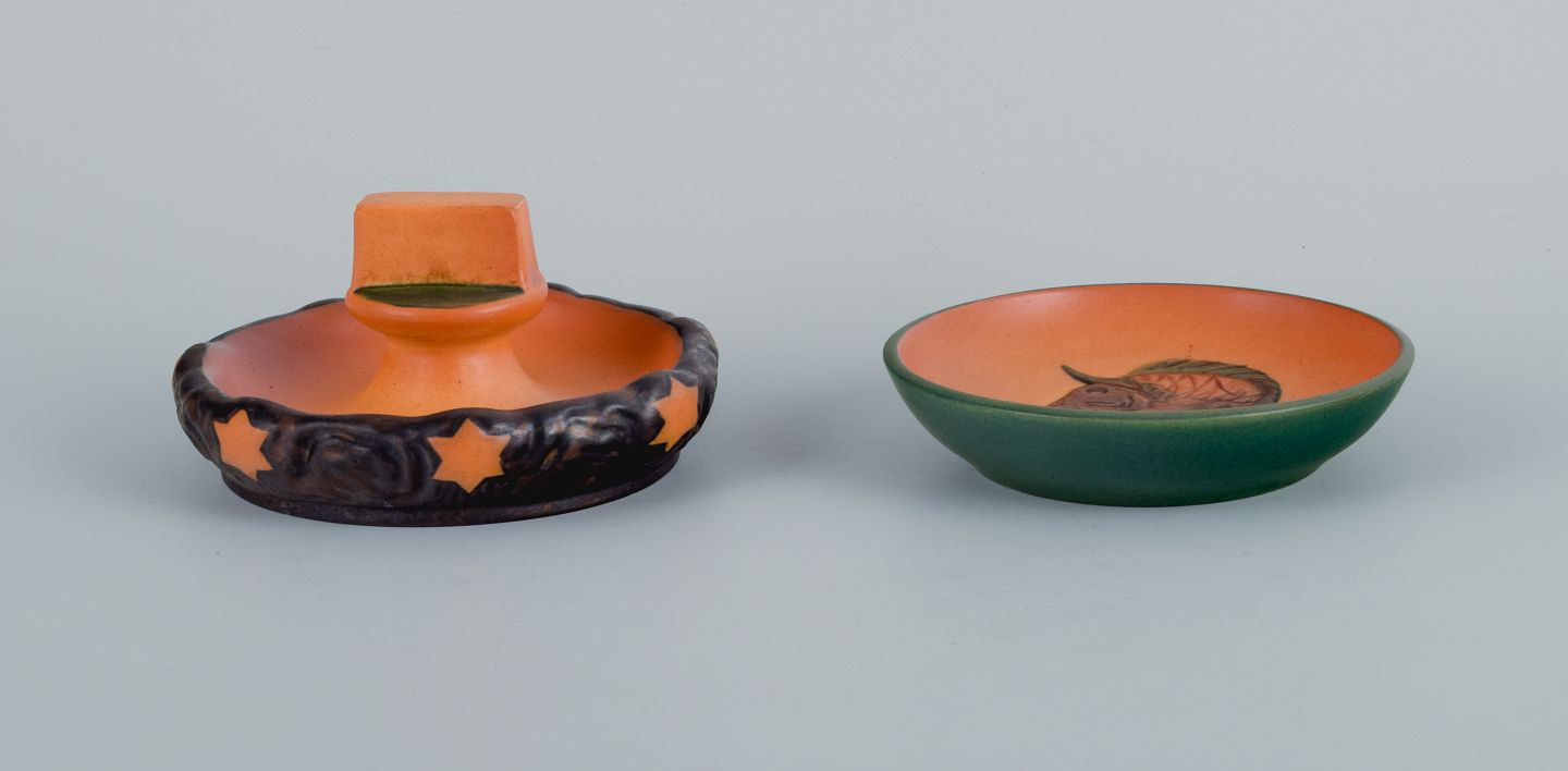 Ipsens Enke. To små skåle med glasur i orangegrønne nuancer.