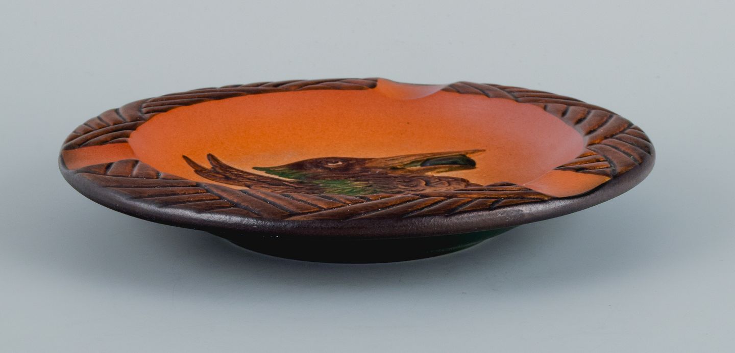 Ipsens Enke. Skål med fugl og glasur i orangegrønne nuancer.