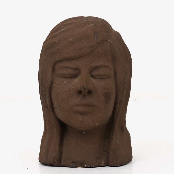 Buste af kvindehoved af uglaseret stentøj.