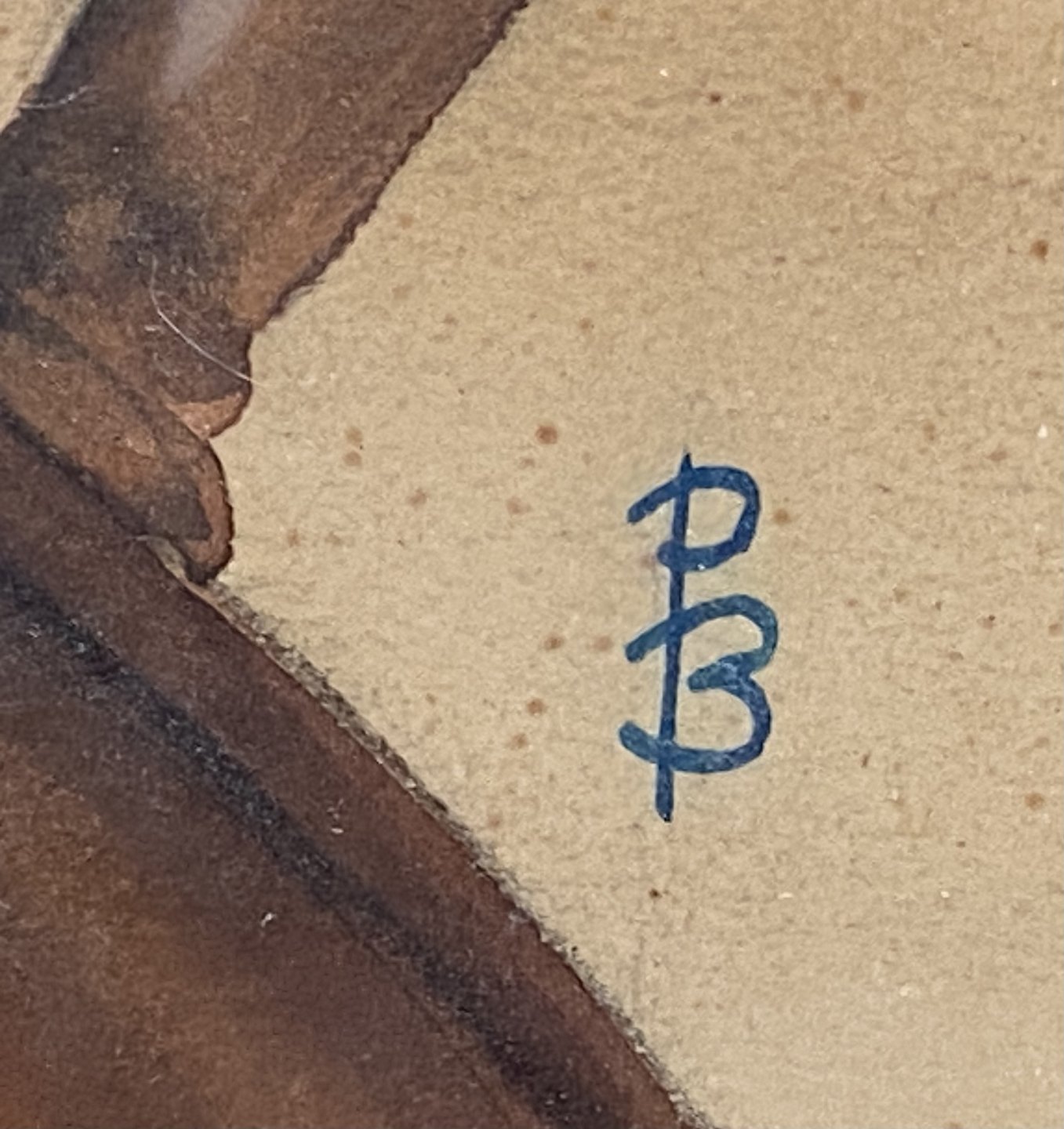 Original illustration for Frederik E. Pedersen Forlag. Watercolor on paper behind glass in a wooden frame. Dimensions: 35 x 31 cm.Signed PM in monogram.Front with moisture shields