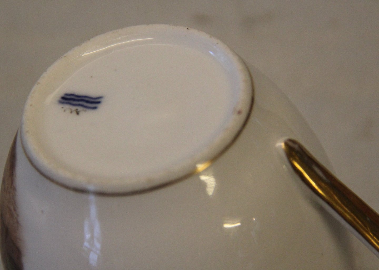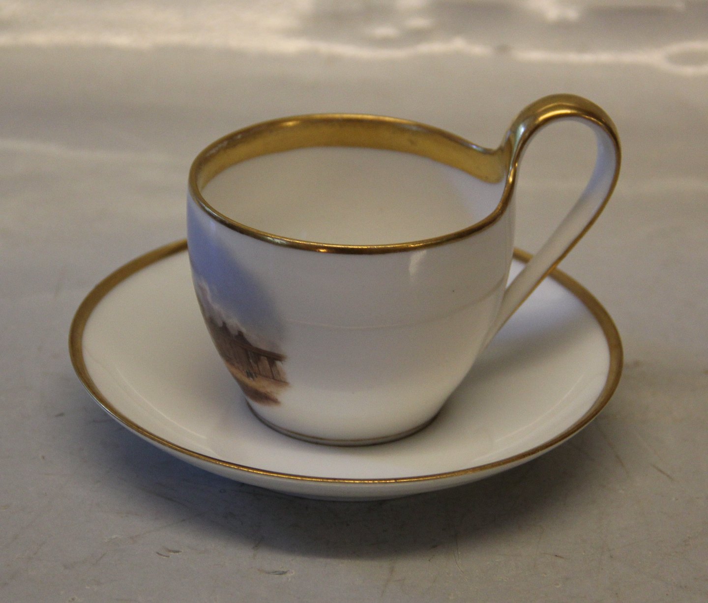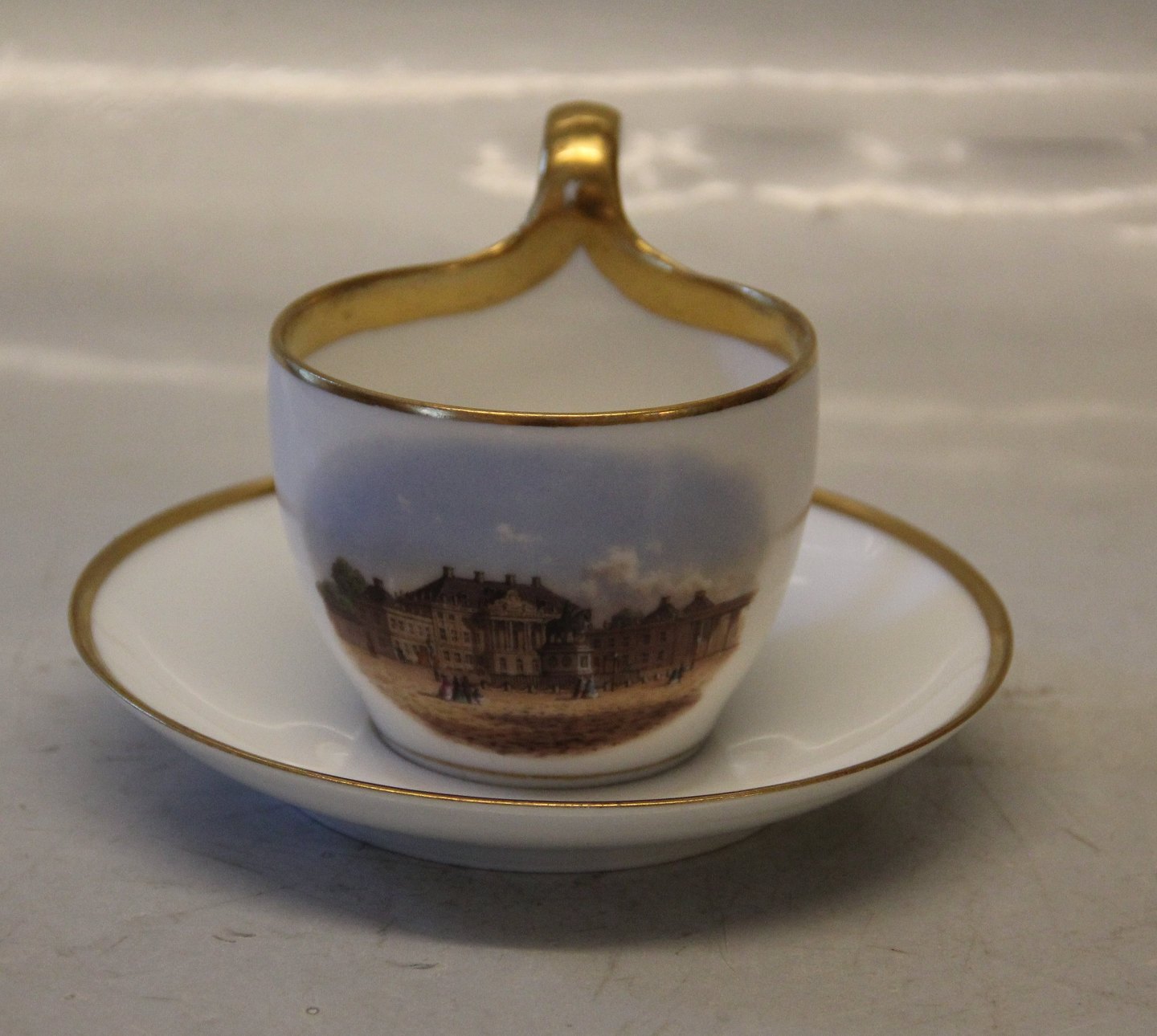 Frederik d. 8.s palæ Amalienborg Kgl. Antik Højhankskop 6.3 x 8 cm (hanken 8.5 cm) og underkop 14 cm Kgl. Prospektkop fra Royal Copenhagen Topografisk maleri fra 1800-tallet . I hel og fin stand med aldersrelateret slid på guldet