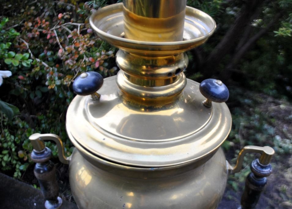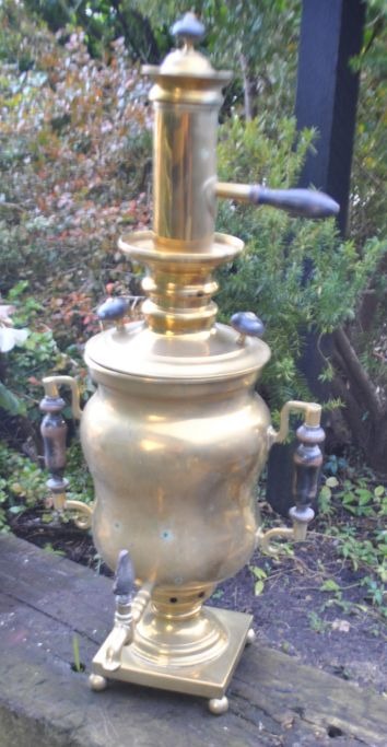 Stor dansk the maskine i messing, 19. årh. På firkantet fod med fire kugler. Hanke af træ. H.: 68 cm.