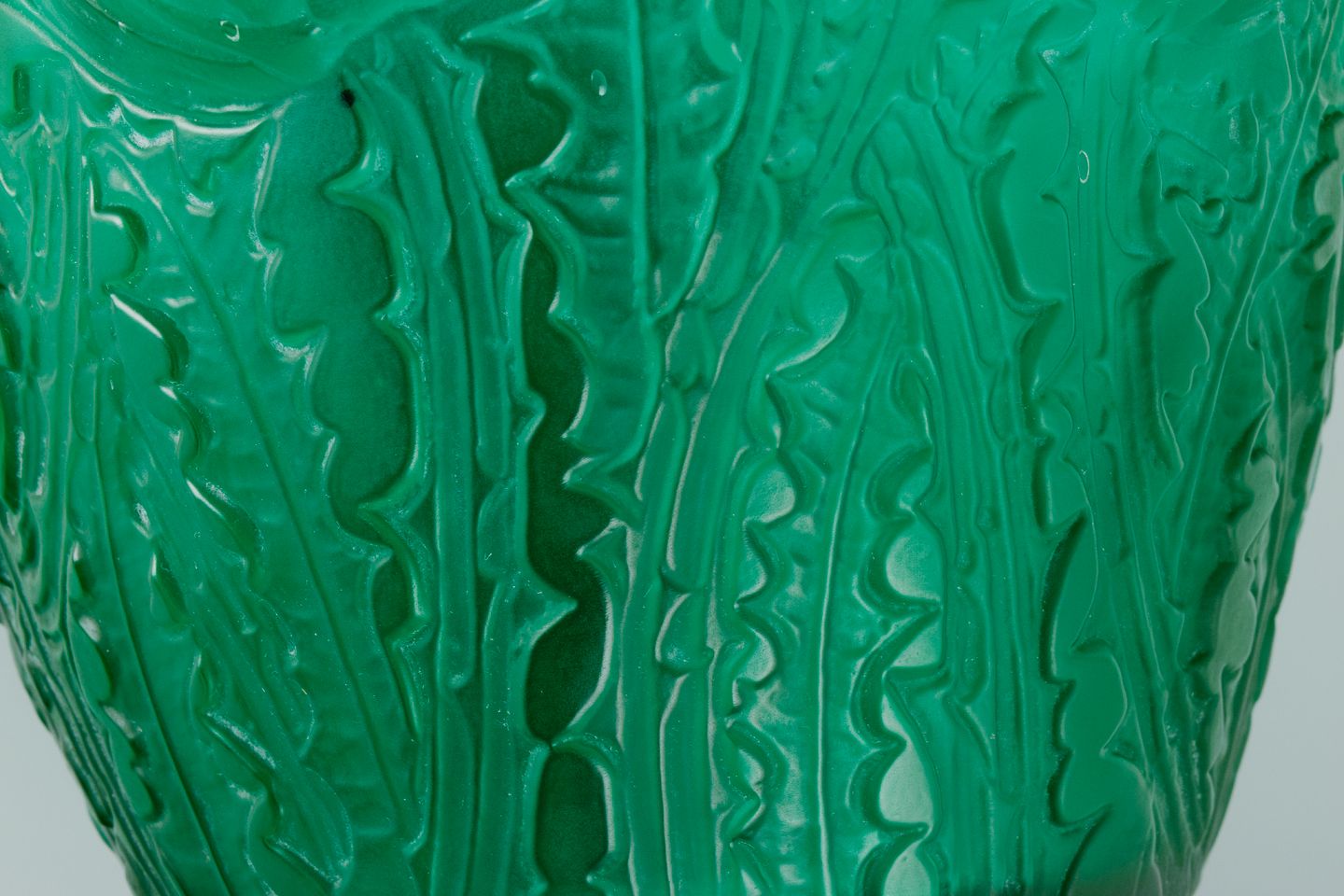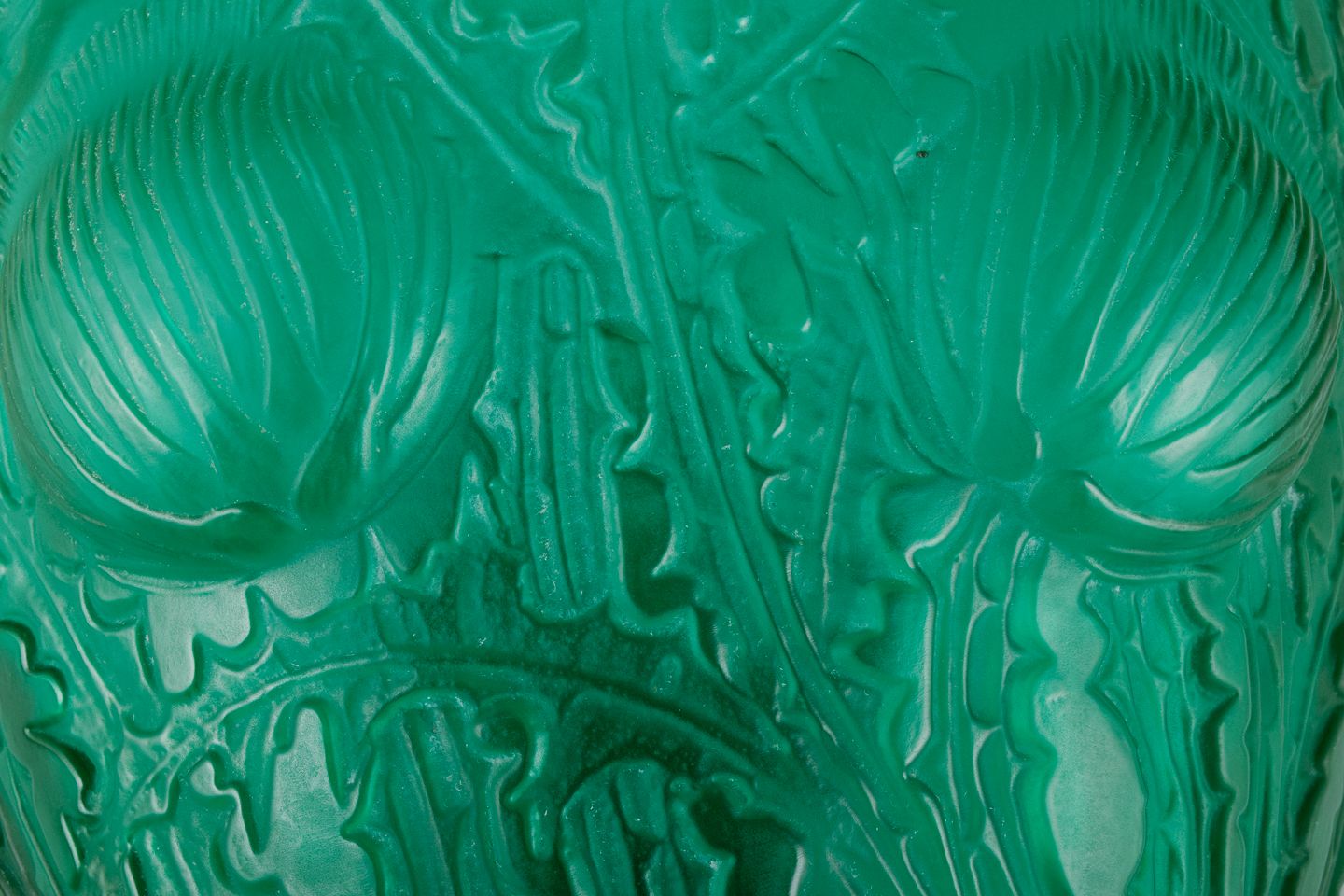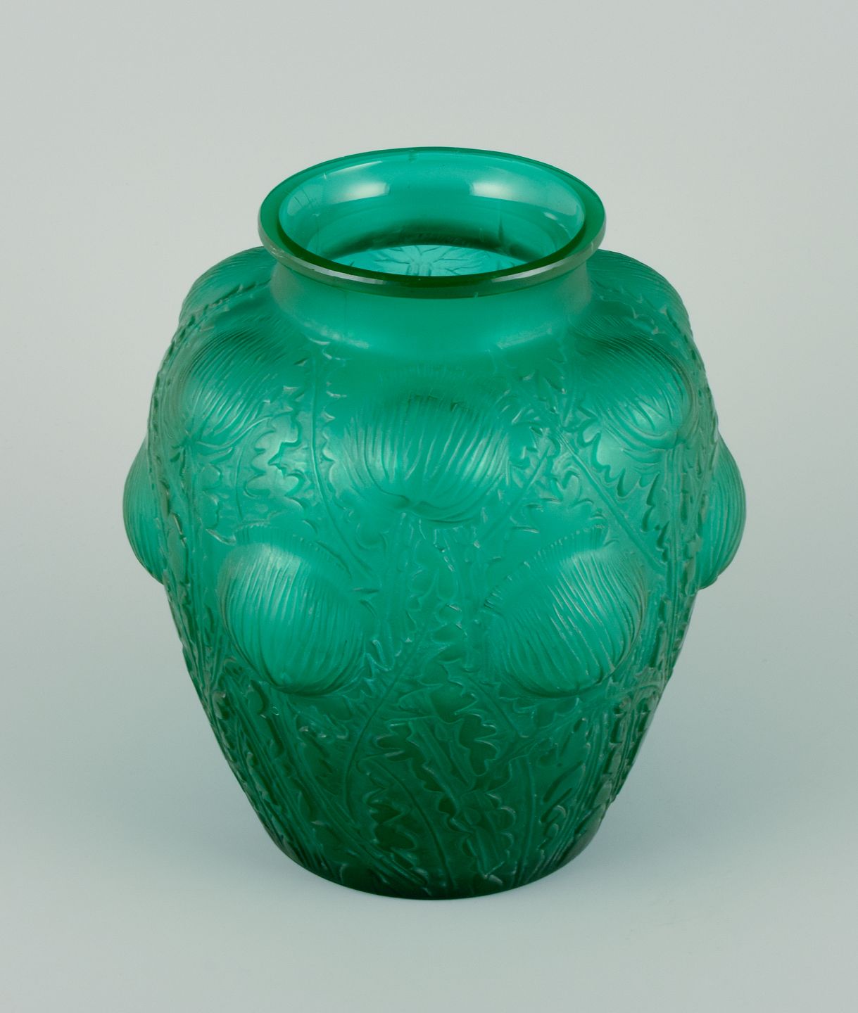 Sjælden Domremy kunstglasvase i grønt glas med tidsler i relief.