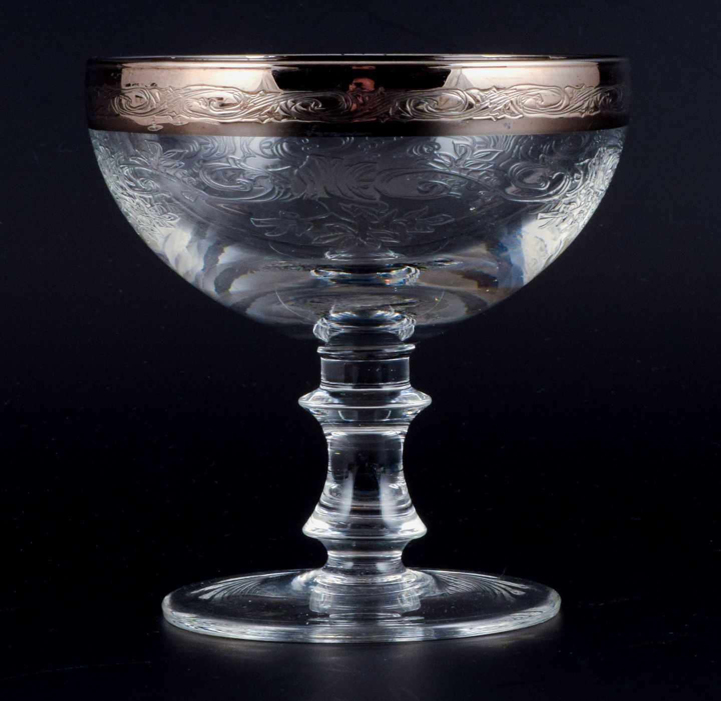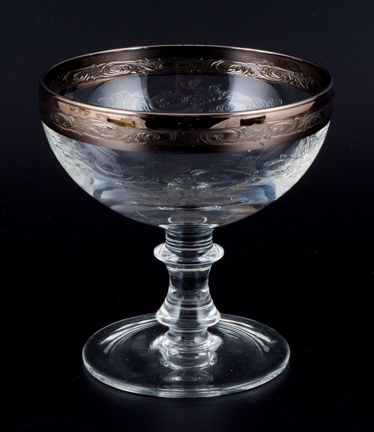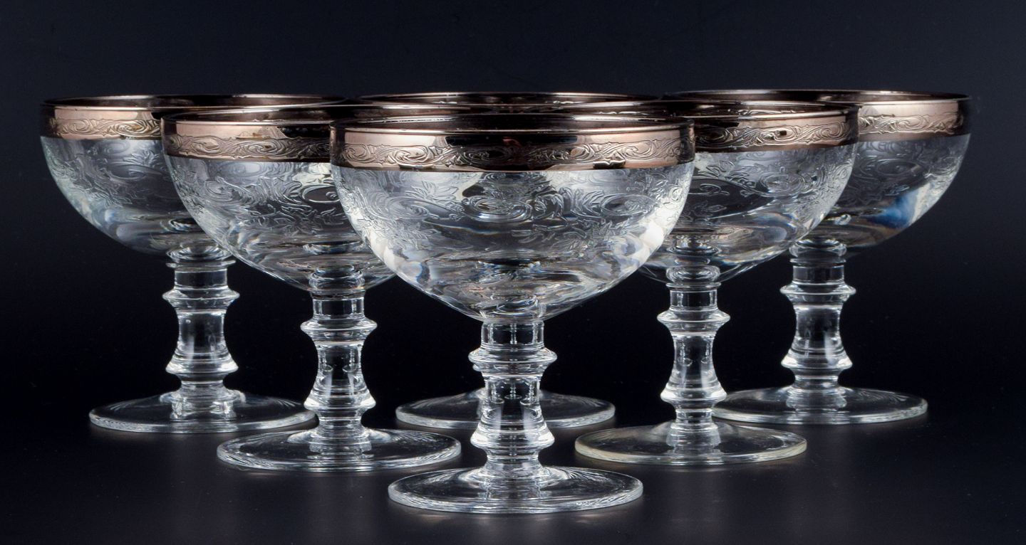 Murano, Italien, seks mundblæste graverede champagneskåle med sølvkant.