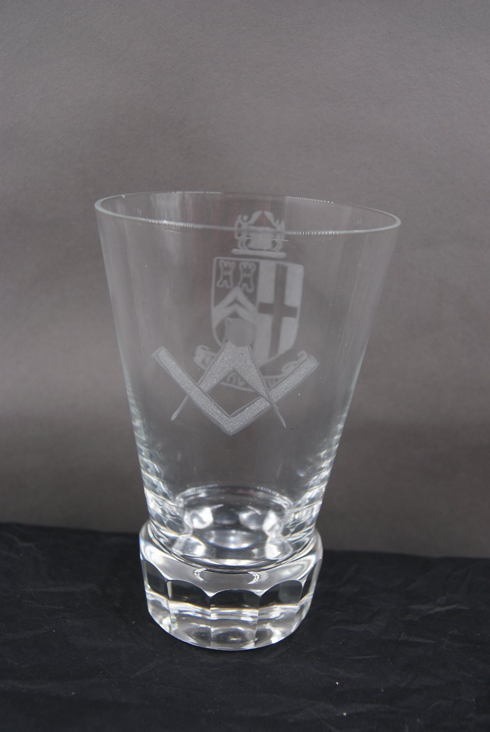 Frimurer glas eller Loge glas, Ølglas dekoreret med slebne symboler, på kantsleben fod.
