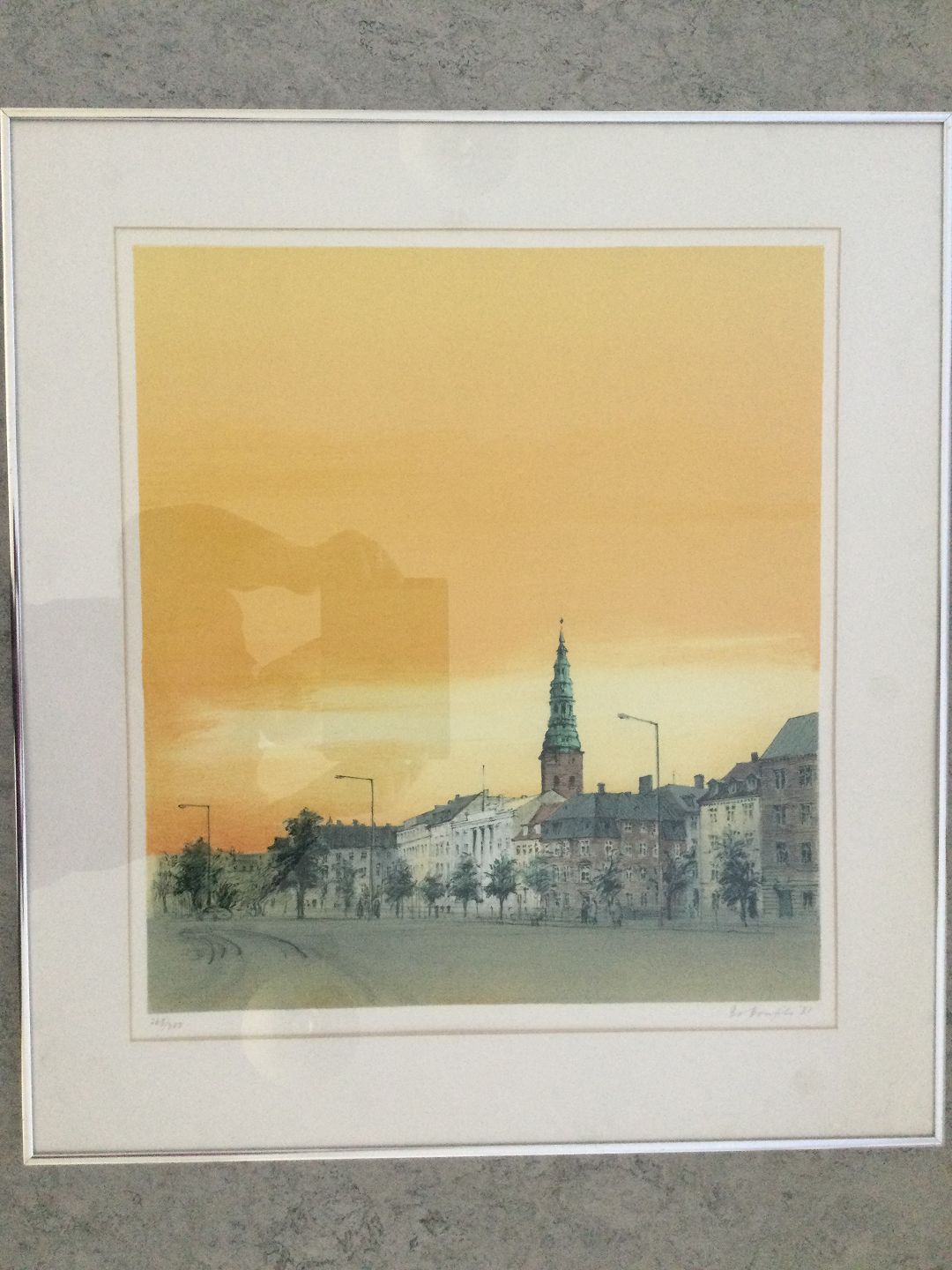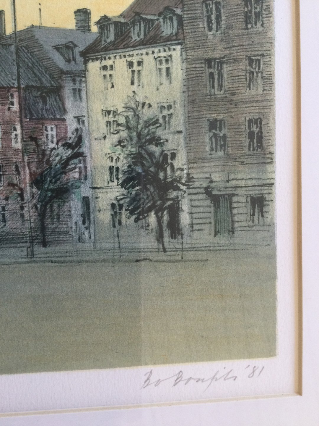 Litografi af Bo Bonfils 1981 - Parti fra Ved Stranden i København med Sankt Nikolaj Kirke.