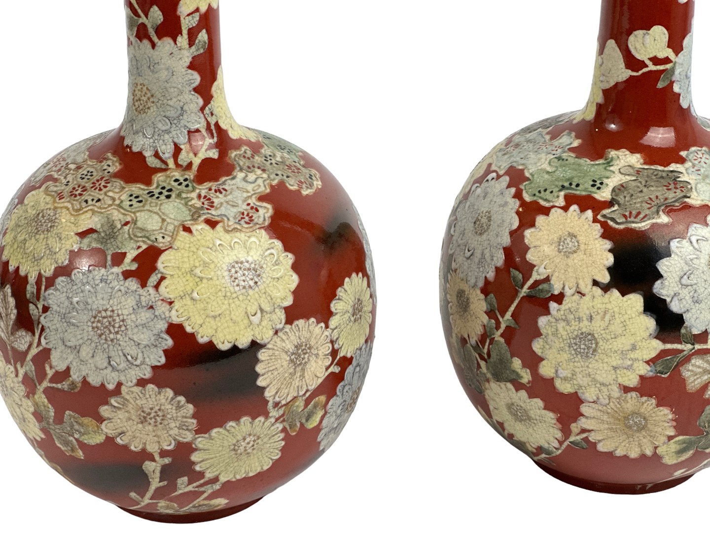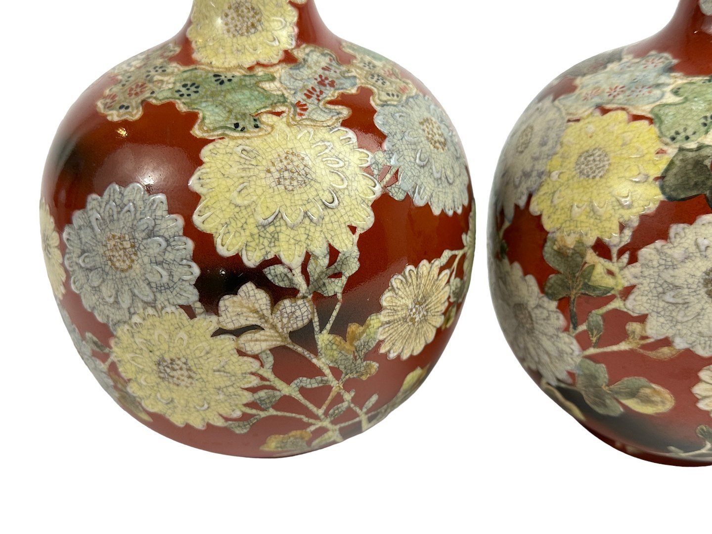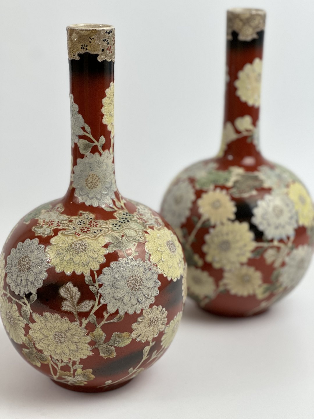 Par flotte asiatiske vaser, antageligt japanske. 20. århundrede. Jernglasur med blomster.