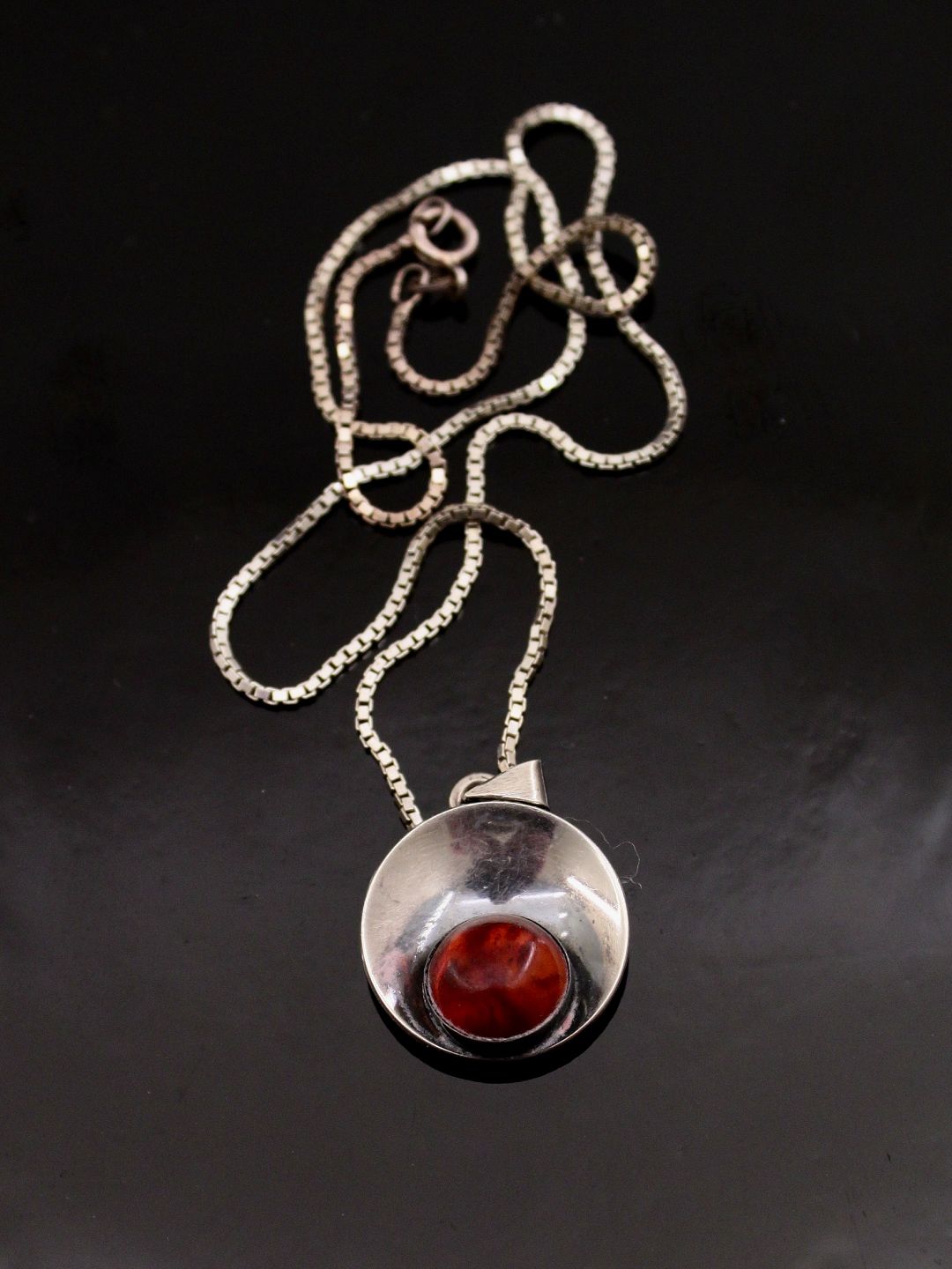 N E From sterling sølv vedhæng Ø 2,1 cm. med rav og kæde 41,5 cm.